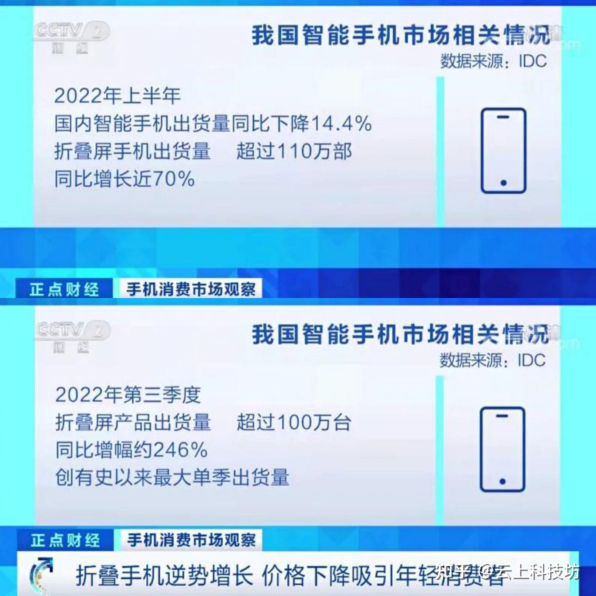 根据IDC的数据,2022年上半年,中国智能手机市场出货同比下降14.4%,折叠屏手机却逆势增长,同时期出货量超110万部,同比增长近70%。刚过去的第三季度折叠屏产品出货量更是超过100万台,同比增幅约246%,创有史以来最大单季出货量。