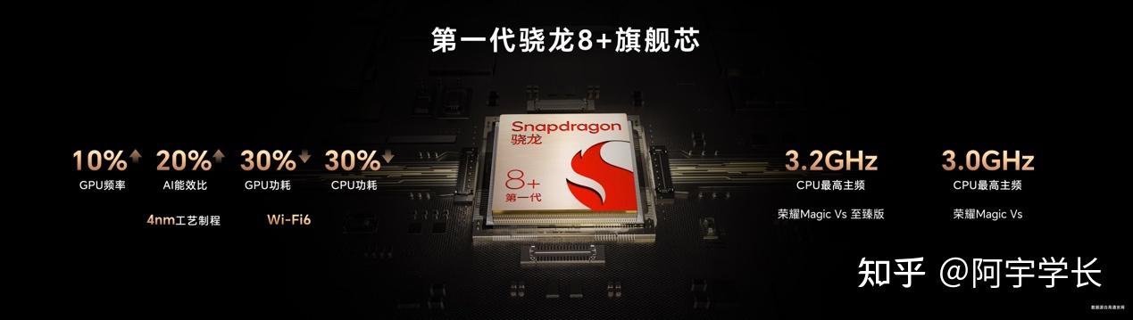 首先说说硬件,荣耀Magic Vs这次搭载的是第一代骁龙8+旗舰芯,4nm的工艺制程是当前安卓最强SOC芯片,根据发布会上呈现的数据,骁龙8+在GPU上的功耗降低30%、性能提升10%,在打游戏、拍照AI类很吃优化的运用场景上,功耗会很低,换而言之就是不会卡。对于有游戏或拍摄需求的用户,这款荣耀Magic Vs是一个不错的选择。