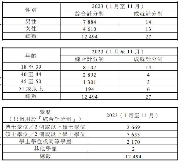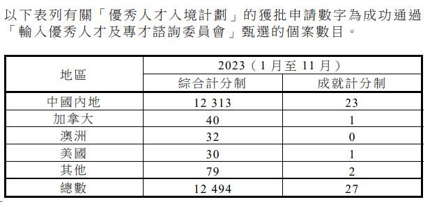1-11月共有71946人提交申请,获批12521人,其中来自内地居民申请人数12336人,通过综合计分制申请12313人,成就计分制23人。