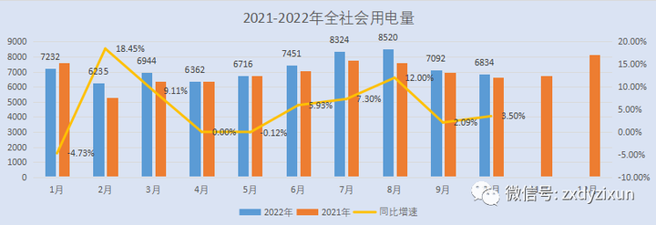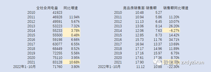 《2010-2021年全国商品房销售额与全社会用电量的关系,双双验证了我们的哪些判断?为什么12月份用电量负增长》2022年1-10月全国工业用电量46266亿千瓦时,同比增速1.8%,制造业用电量35171亿千瓦时,增速为1%,化工行业增长5.3%、有色行业增长2.9%、黑色行业下降4.9%、建材行业降低3.2%。