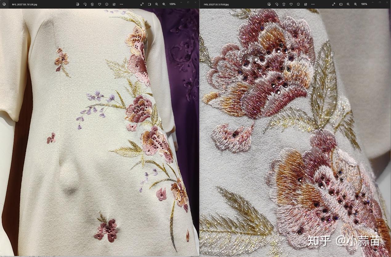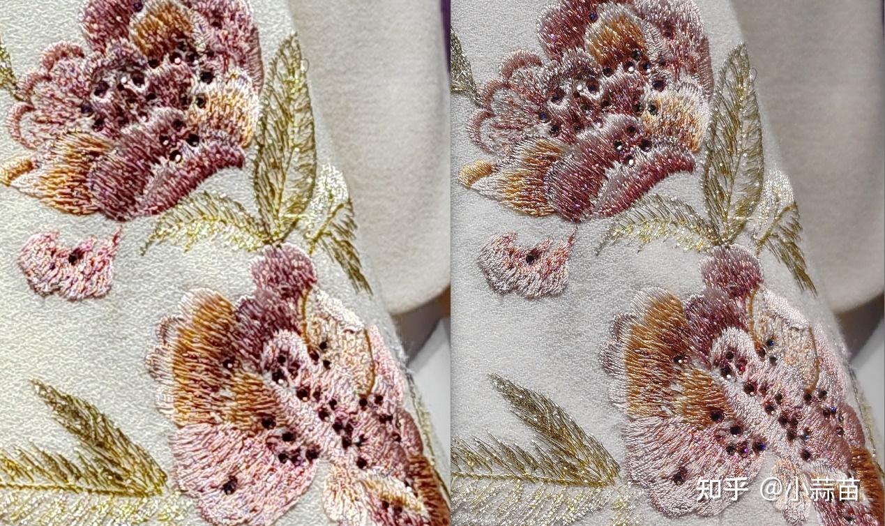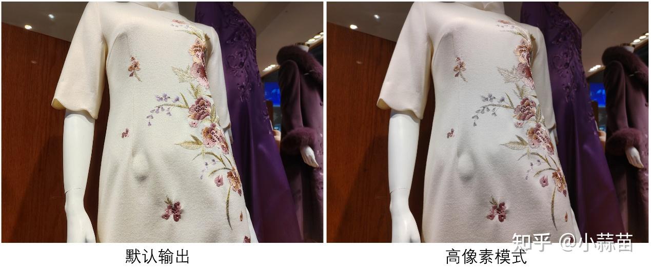 考虑到二者的分辨率差异导致的100%放大后的视角差,我们缩到同一分辨率下看细节纹理表现差别,注意看丝线的纹理和色彩呈现,左侧默认模式的细节基本糊掉了,右侧1.6亿像素模式下的输出依然非常清晰。