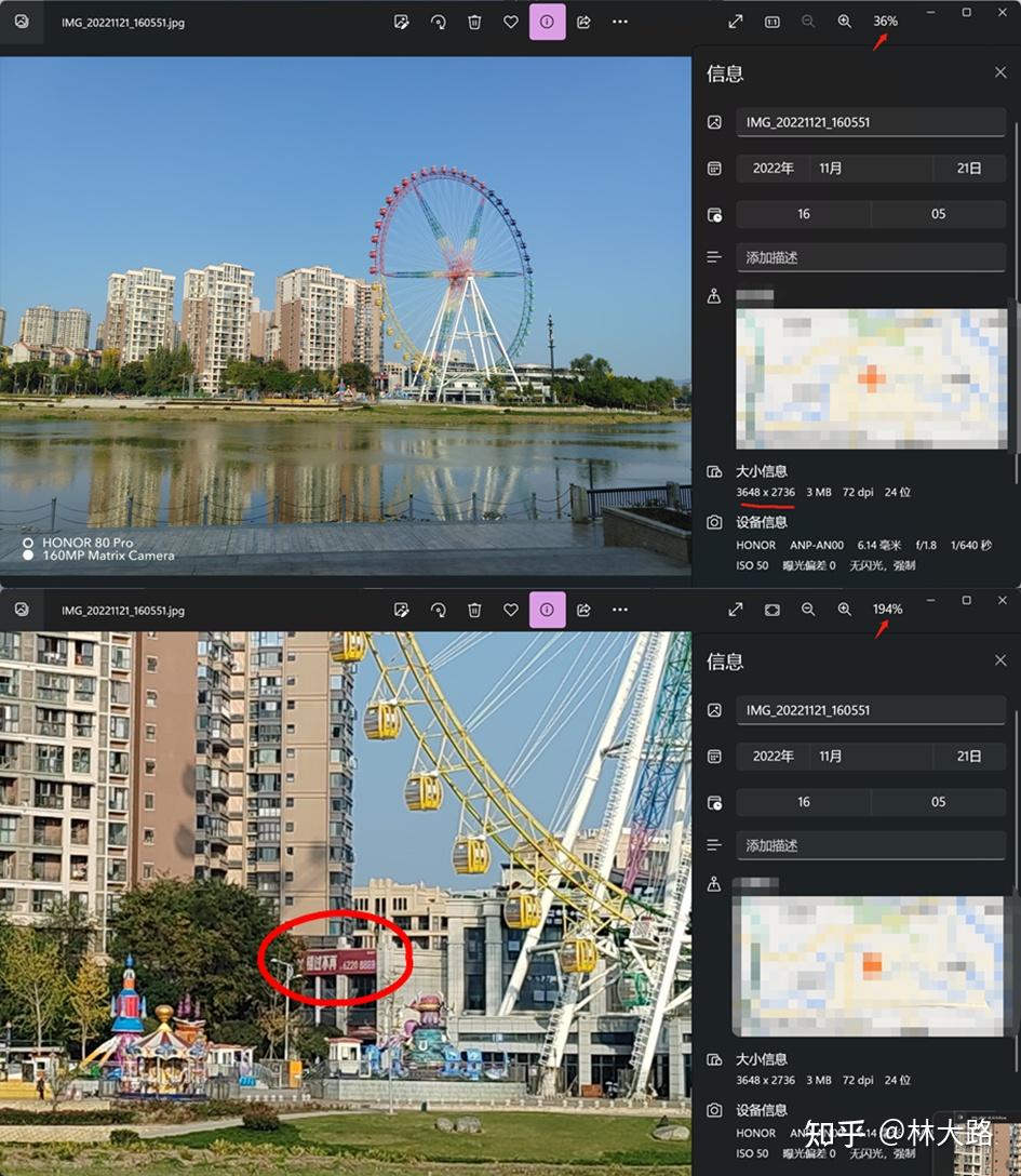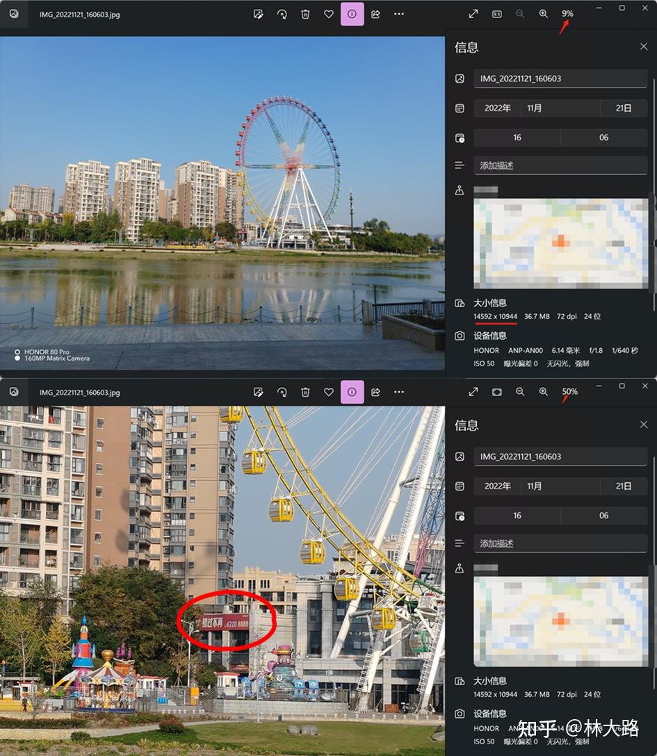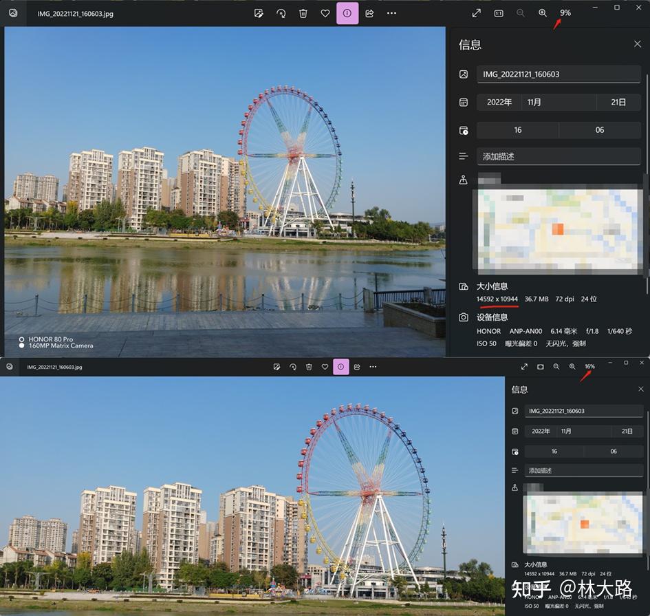 有的朋友可能会担心1.6亿像素模式下拍摄的照片文件太大了,我把1.6亿像素输出图片缩图到1000万像素之后,发现依然还是比模式直出的细节更好一些,这个就挺有意思了。