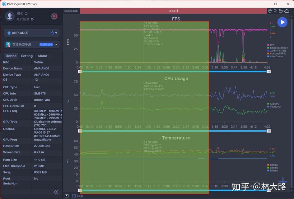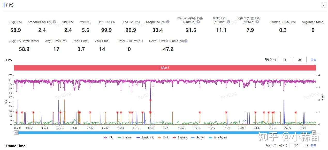 实测原神,最高画质,60fps模式,室温20℃左右,半个小时的游戏,整体的帧率表现稳定,平均帧率58.9: