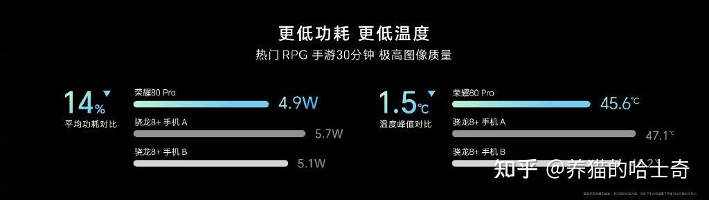 骁龙8+处理器 + VC立体散热系统 + GPU Turbo X技术,使得荣耀80 Pro玩游戏的体验更加的优秀,现在大家都不爱跑分了,都是跑《原神》,以极高图像质量畅玩30分钟《原神》平均功耗下降14%,温度峰值下降1.5℃。