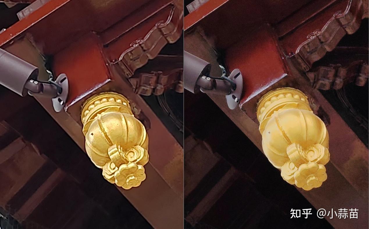 这个场景实际上已经是小逆光了,屋檐下整体的亮度已经处于偏暗的水准了,但我们看二者的细节差异,非常明显了。