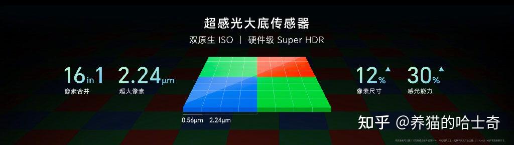 - 高感光:单像素尺寸为0.56μm,支持十六像素合一技术,等效像素尺寸为2.24μm,这使得进光量提升了30%,在暗光场景中会有很大的帮助;