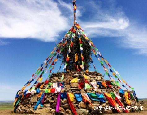 敖包也叫“鄂博”,是蒙古族语音译,即“石头堆”的意思,它由人工堆积而成,数目、大小、高低不等,中间竖有苏立德(意为招集英灵之魂的地方),有的还插有树枝,挂上各色布条。敖包最初只是道路和境界的标志,也有一些敖包是为纪念某一事件或活动而堆积的,具有碑铭的意义。后来,由于宗教的影响,敖包被尊为神物。蒙古族即使在寻常的旅途中,路经敖包都要下马施舍,因此敖包在蒙语中也引申为“供奉的每年都要举行盛大的祭祀活动。祭敖包通常在每年四、五月份各举行一次,祭祀的礼仪很多,主要的有火祭、酒祭、血祭,古代的王公大臣们还用玉祭。现在最常见的是酒祭。祭敖包的礼仪结束后,一般都举行赛马、摔跤、唱歌、跳舞等娱乐活动。而蒙古族的男女青年往往也在敖包前相知、相恋,这也许就是《敖包相会》的由来吧。如今,敖包又演变成为迎送宾客、表达礼庆贺丰收、憧憬美好生活的民间活动,吉祥之地。每当客人到来,都要到敖包处迎接行祝酒礼,以示欢迎、尊敬。客人归去时,也要行至敖包行祝酒礼(俗称上、下马酒)求神保佑路途平安。