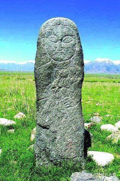 古墓石人位于新疆博乐温泉县哈日布呼镇西北约25公里处的阿日夏特草原,分布着较密集的石人石堆墓葬,这些墓葬形制规格不一,有圆阵、方阵,还有在圆阵外围用卵石摆成“放射形状”的,总计多达数百个,在这些墓葬中,有两座东西相距500余米的石人石堆墓,东面的石人面向东偏北5度,高出地面1.45米,为白砂岩石的全身雕像,圆脸、大目、八字胡须,身着反襟大衣,腰系宽带,右手持杯,左手杖刀,颈戴项圈,足蹬皮靴,腰带上还佩有一把小刀,刻法比较精细。