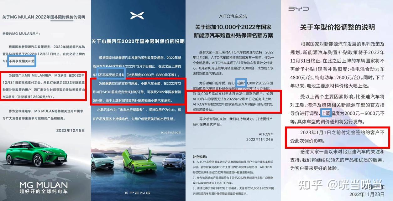 继11.23比亚迪官宣因补贴退坡要涨价后,问界,吉利,埃安,小鹏,名爵等品牌纷纷跟进说也要涨价。