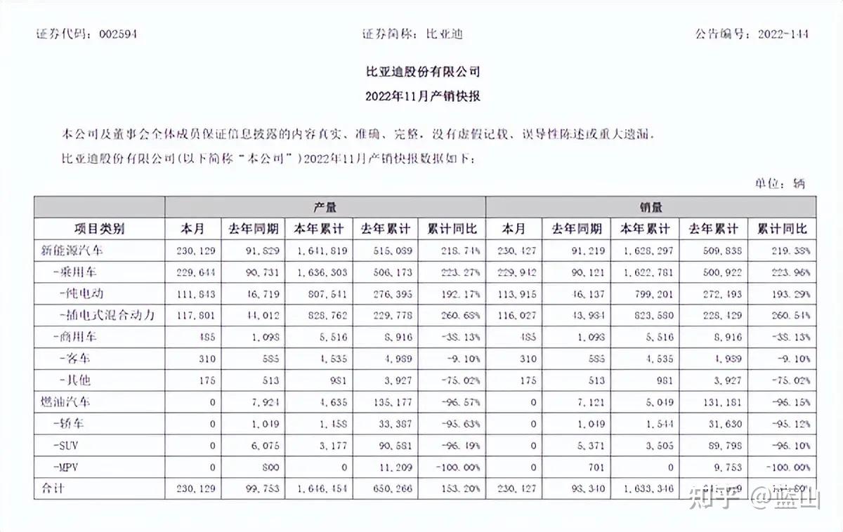 比亚迪的情况跟特斯拉刚好相反。比亚迪2021年1~10月的销量是53.9万辆,而2022年1~10月达到了惊人的139.8万辆。