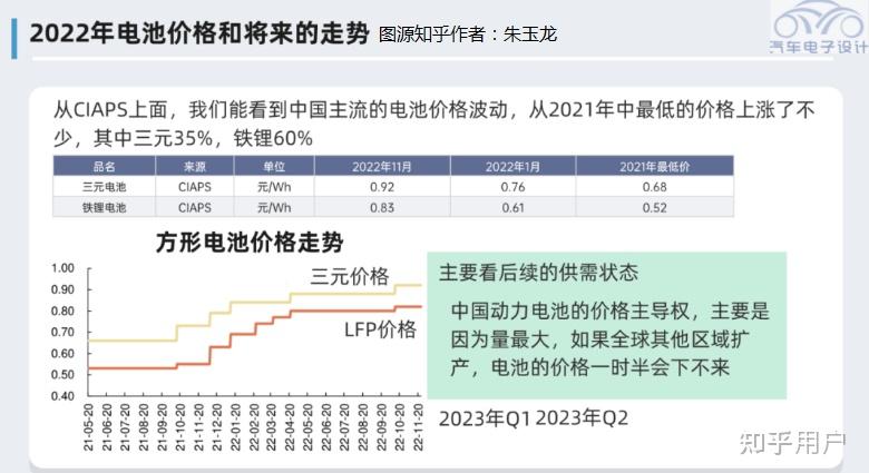 从CIAPS上面,我们能看到中国主流的电池价格波动,从2021年中最低的价格上涨了不少,其中三元35%,铁锂60%。