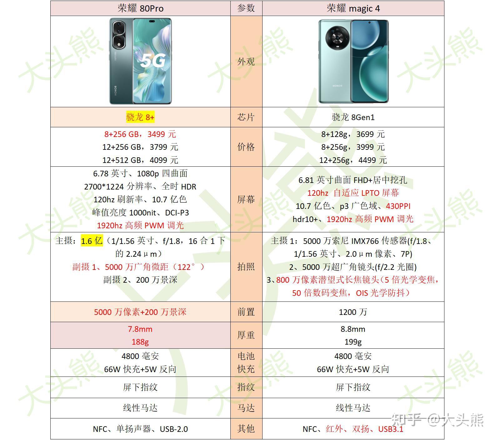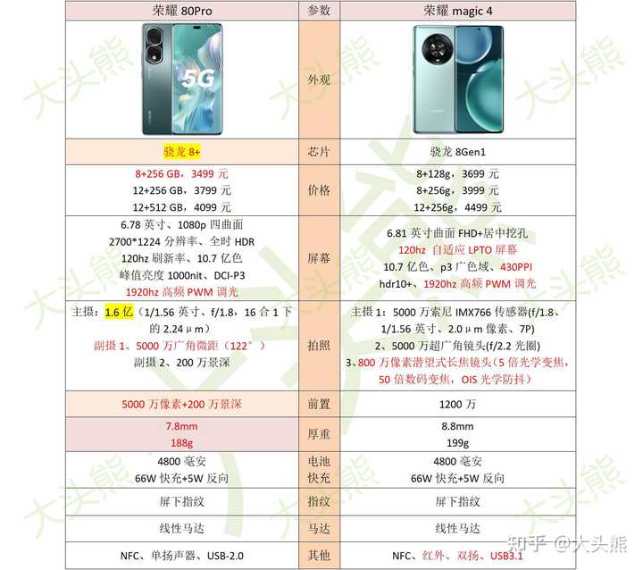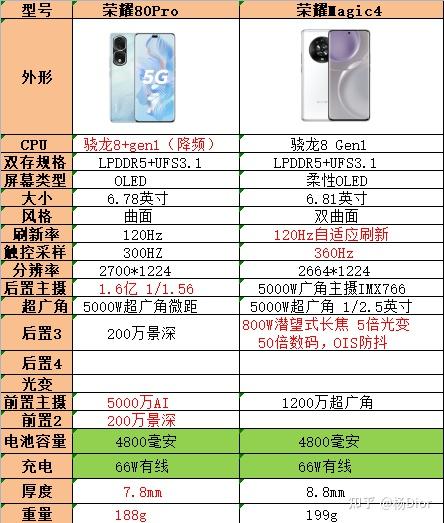 荣耀80Pro和荣耀magic4的主要参数图