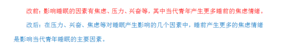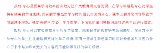 2.复述。很多地方都可以用到复述法,重复部分内容提取中心要素和关键词,充分理解,然后用自己的语言复述出来,同义词替换也包括在此方法中,保留专业词,改掉其他描述性的词。我主要用在修改理论介绍和引用部分。例如: