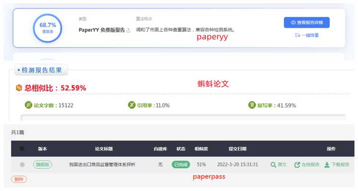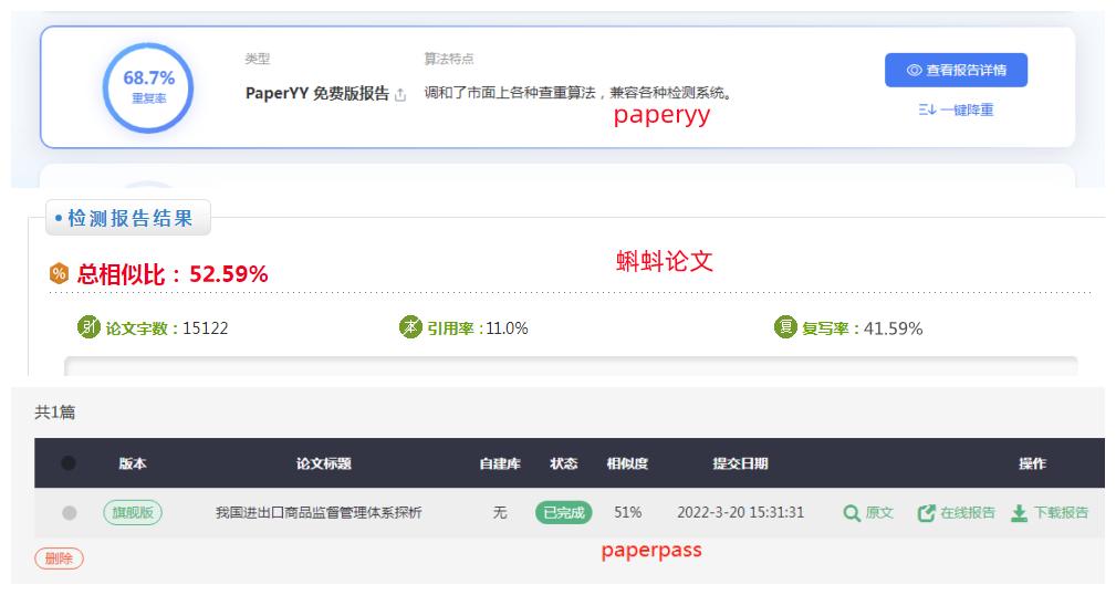 使用蝌蚪论文降重工具 比如我的初稿查重率yy60%多,蝌蚪50%多,paperpass50%多(以上yy是免费版,其他使用付费版本),这结果心慌慌啊!特别是YY免费的都这么高,付费的会想死。