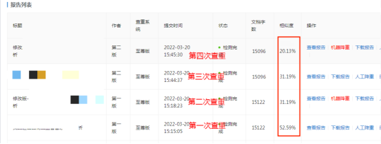 四次查重结果 两次降重记录 使用蝌蚪论文智能降重的感受就是系统明显运用了“插词、同义词替换、语序调换、删除和少量的复述”逻辑,但是需要自己调整。最大的优点就是速度快,提词效果好,价格便宜(要知道人工降重的价格可是很高),必须是懒人必备神器!对了,在网站大家看下查降套餐,很优惠,10次都还没一次知网的查重贵。所以这个必须是神器!