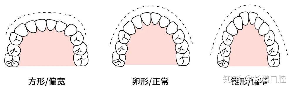 想要了解“扩弓”,首先要搞清楚“牙弓”。在牙床上,牙齿沿着牙槽骨依次排列呈现“U”型,从二维平面看,它就像一把弓箭,所以称之为牙弓。根据牙弓的形态,可分为方形、卵形和锥形三种。