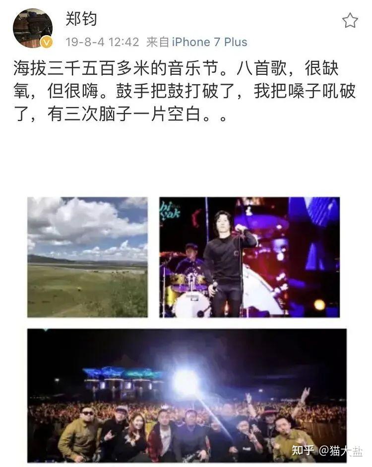 20.结果下一次还是会失控。这也是一个优秀摇滚歌手的修养,郑钧对现场永远是毫无保留,全情投入。2019年,郑钧去海拔三千五百多米的音乐节,八首歌很缺氧,他还是使劲唱,把嗓子吼破了,有三次脑子一片空白。