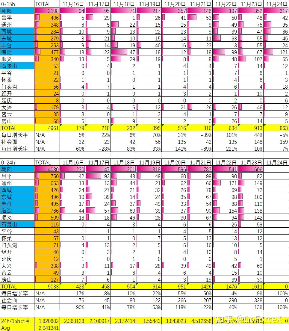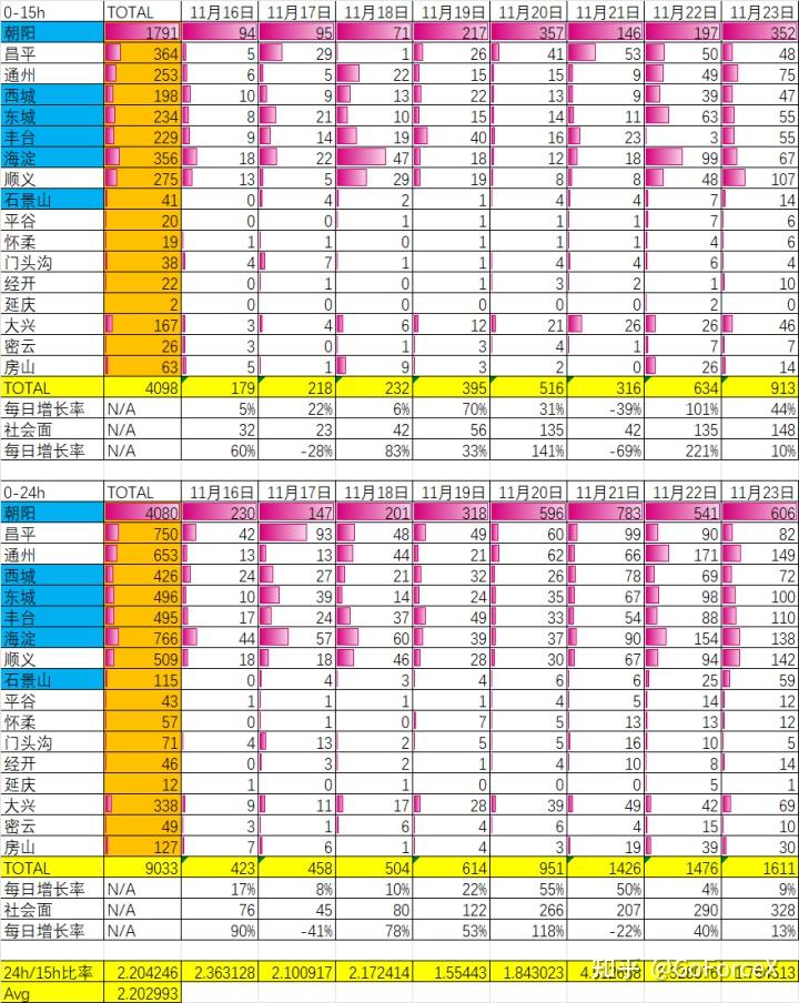 北京 0-15h 及 0-24h 各区新增感染者统计: