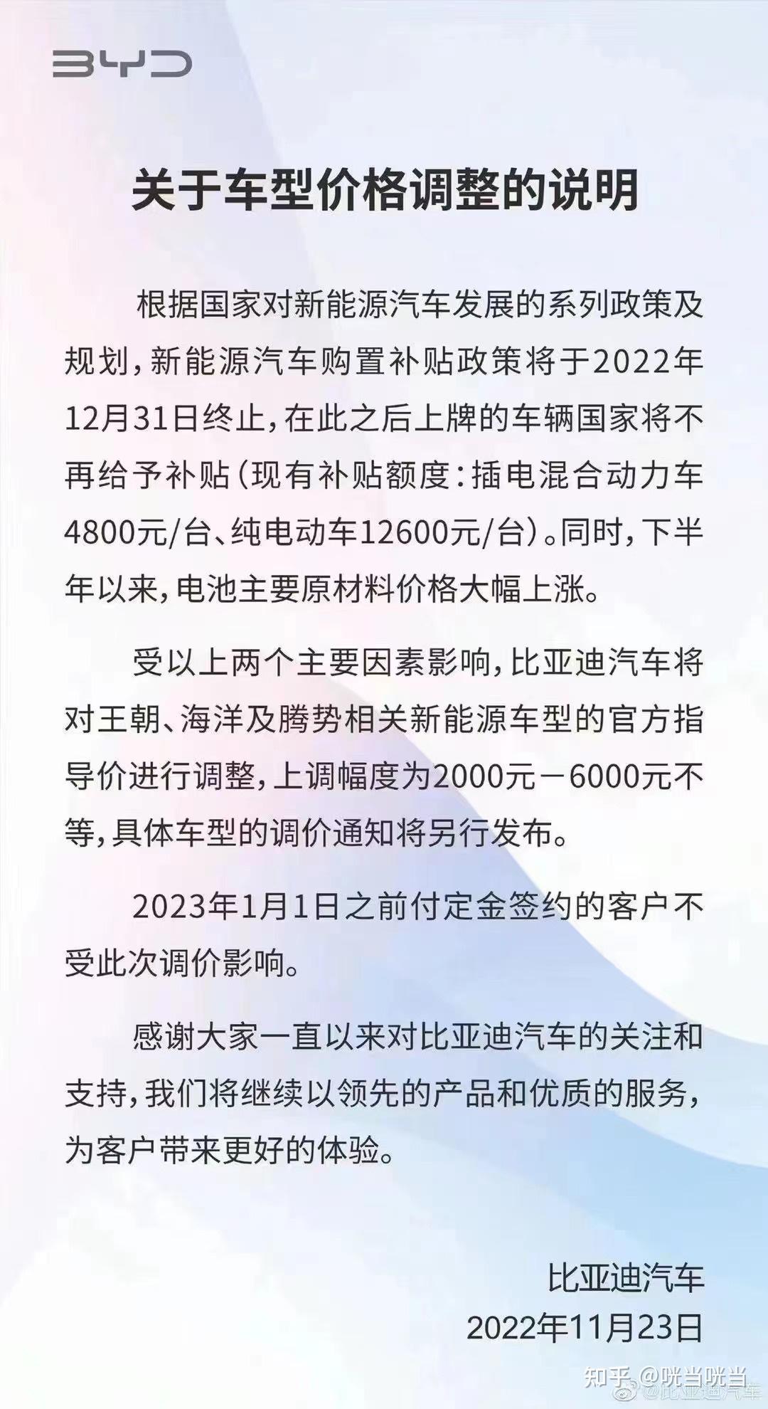 原材料涨价,补贴取消,再加上市场也认可比亚迪,涨价是唯一的选择。