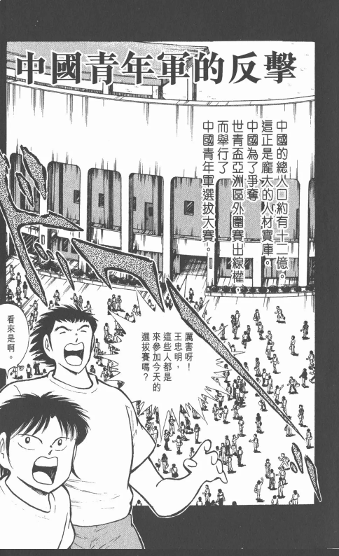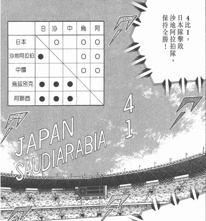 于是在足球小将世青篇的第9卷,中国和日本、以及本届世界杯击败了阿根廷的沙特队均被高桥老师分在了世青赛预选赛同一组。
