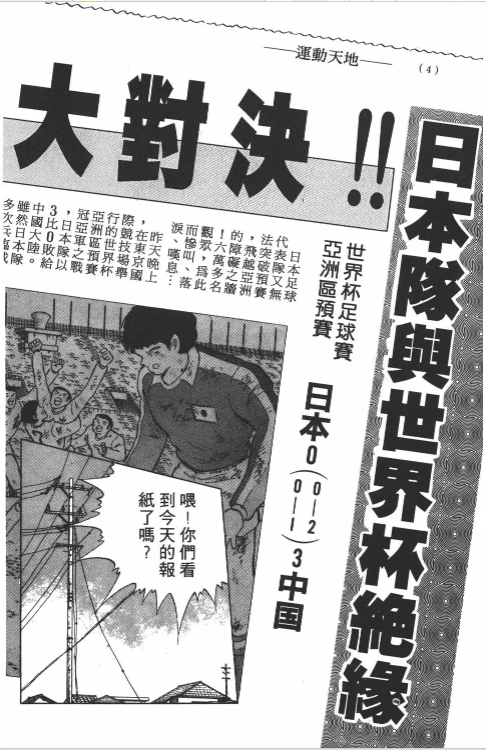 足球小将自81年连载开始,从南葛小学出发,到世青赛、至欧洲、奥运会,甚至今年依旧在连载。长寿的作品自然也难免带着历史的印记。88年,连载了八年的足球小将第一部完结,这年jump第15号,足球小将350话——各自的旅程一话,讲述了小次郎和翼的决斗结束后球员们各自新的征程。这话的报纸,不但刊登了若林加盟汉堡的情报,还刊登了下面这张日本亚洲杯预赛0:3不敌中国队的消息。由此可见,这个时候中国对日本是很占优势的。这一年,日本球员注册人口不足40w。