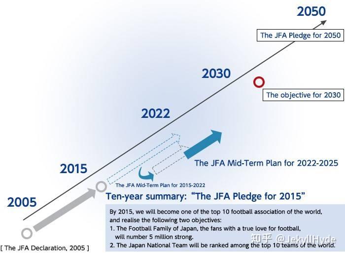 其实日本足球能崛起,远不是一部漫画能概括的。1996年,日本足协主席川渊三郎就为还没有打进一次世界杯的日本队制定了日本足球百年计划,涉及职业联赛、青训、国家队等多项举措。聘请优秀教练,归化外籍球员等等。2002年日本足球初见成效,打入16强。2005年他有推出了2050年宣言。到时日本拥有1000w足球人口,实现注册球员达500万、裁判员达50万和教练员达25万,申办2050年世界杯并夺冠。