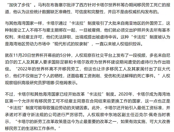 宏观叙事是这样的,引导受众说才死了几千个了,才不管那是一条条非正常死亡的人命。70%的男婴和溺死的女婴就不说了,单说这次“炒作”的国家也有原本的受害国(劳务输出国),其次不止是死亡问题,劳务输出到卡塔尔必须要在本地找个人作为担保人,而且最离谱的是离境也要许可,这意味着在大多数情况下,担保人对劳务人员有某种程度的“控制”。