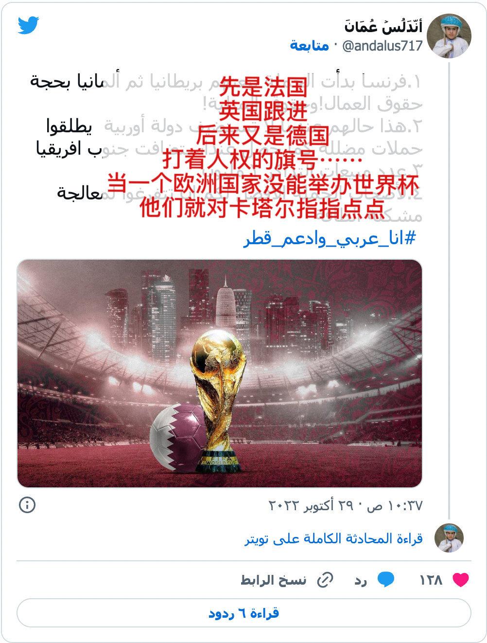基于这类因素,洼人的鼓吹动机主要在于自身极其强烈的反动价值观可以拿卡塔尔来做正名(我们恶棍,反派的受众比你们这些“伪善”“普世”人说的多,不止俄,伊,朝鲜之流吧),远距离精神“抱团”。