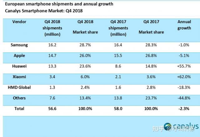 19年5月禁令前在欧洲的持有量是比较高的,18年华为销量在欧洲排第三。