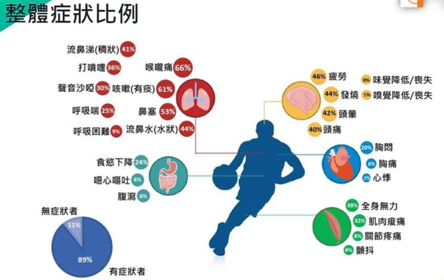 卢柏伶表示,调查发现运动员在新冠疫情期间3年来到今年10月为止已有52%人染疫,染疫的高峰就在今年Omicron本土疫情大爆发的5月与6月。其中多达89%在确诊后有症状,最常见的前三大呼吸道症状,为喉咙痛占66%、咳嗽(有痰)占61%与鼻塞53%。