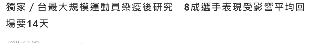 卢柏伶说,这次调查也发现,运动员确诊者有92%都是轻症和无症状,若出现症状平均会长达5.4天、无症状或轻症感染运动员,平均回归训练或比赛需要约10.8天;完整回场且无症状平均需要14.6天。