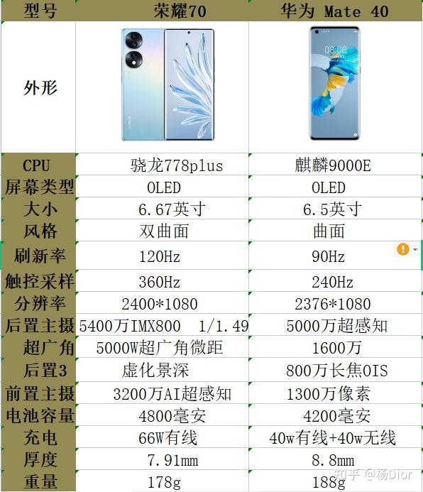 - 屏幕不同,华为Mate 40是90Hz的OLED曲面屏,而荣耀70是120Hz的OLED超级双曲屏;