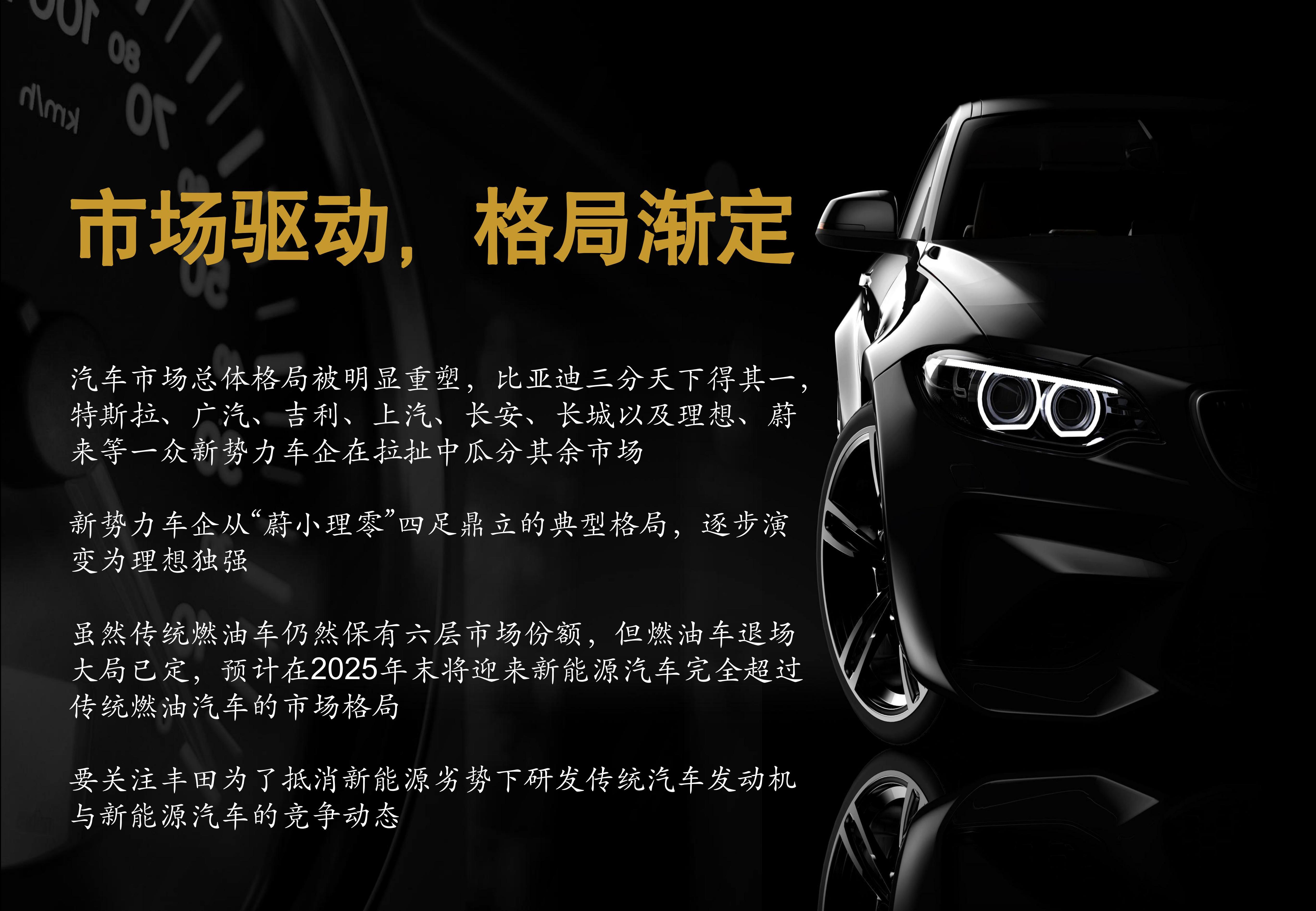 3. 要关注丰田为了抵消新能源劣势下研发传统汽车发动机与新能源汽车的竞争动态。