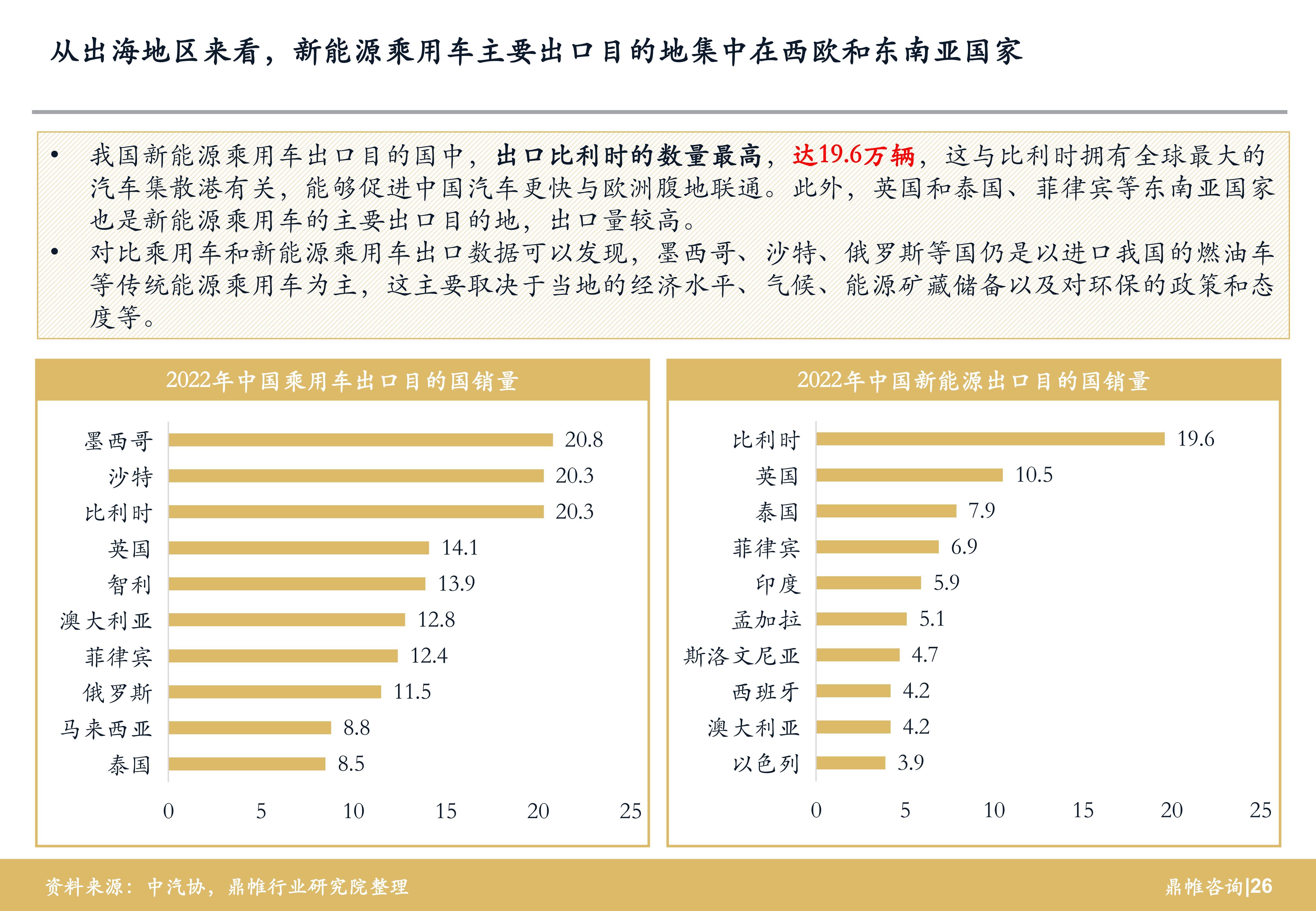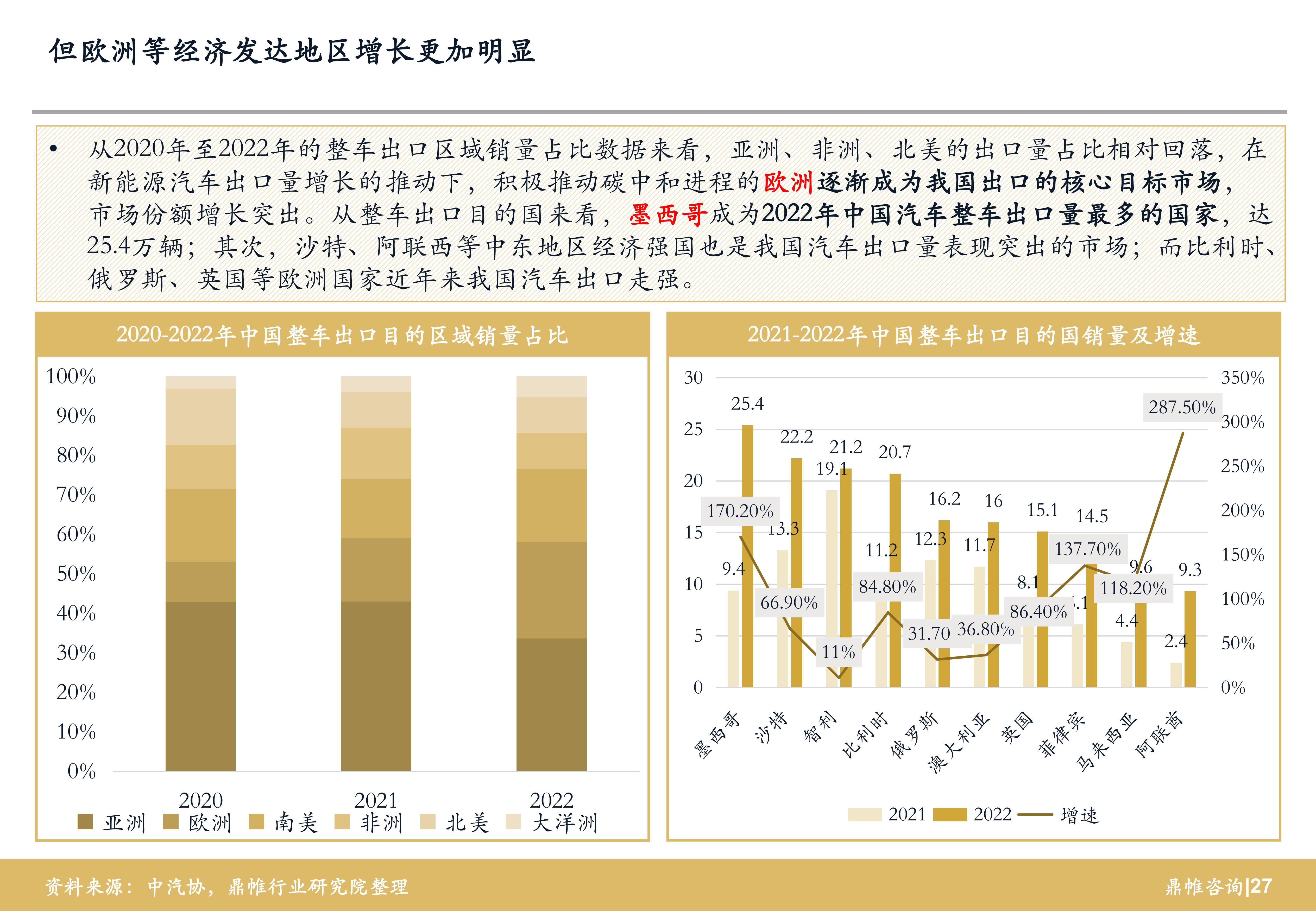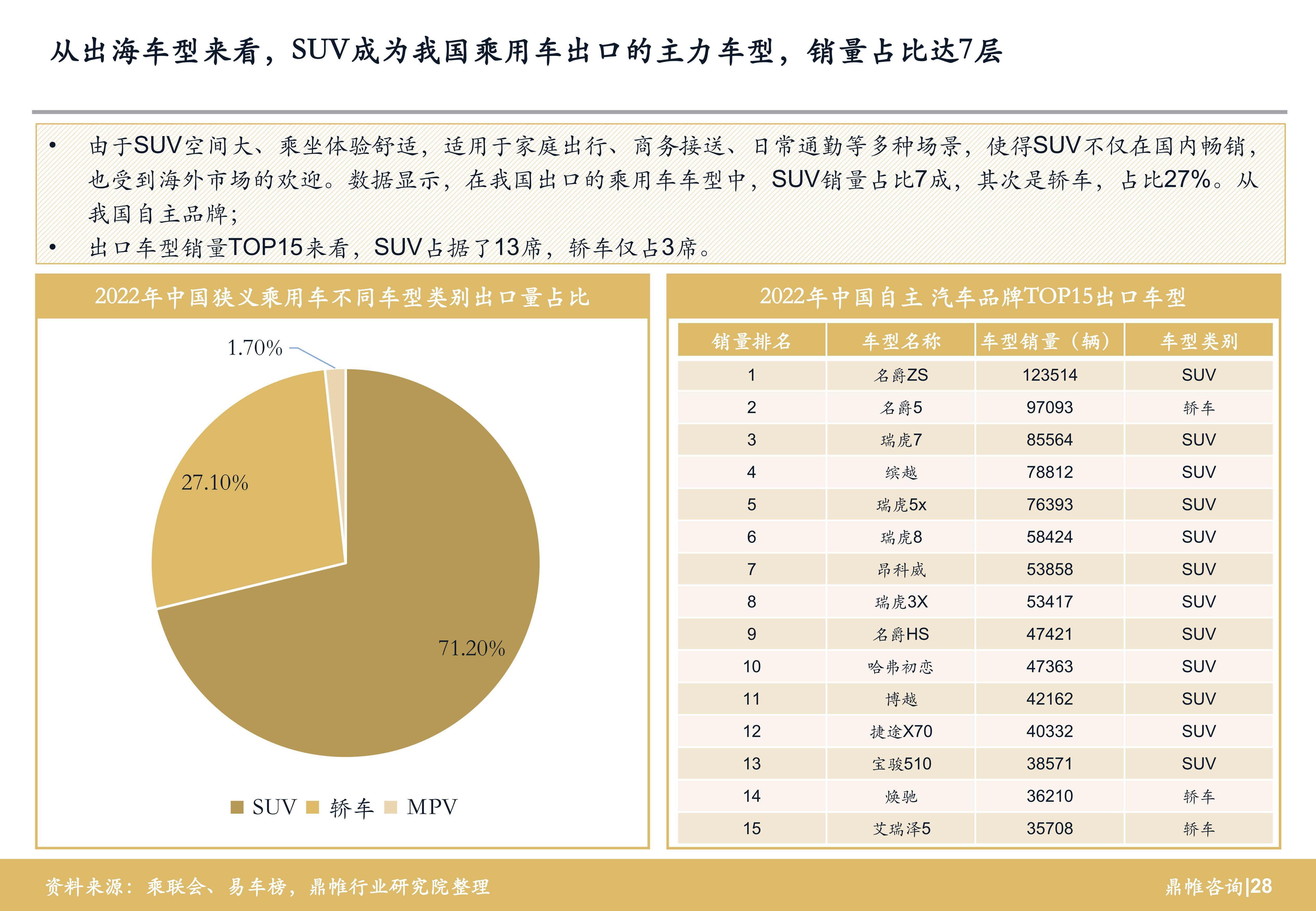 2. 目前,我国车主要出口目的地集中在西欧和东南亚国家特别是在欧洲等经济发达地区,中国车企的销售增长更快,其中SUV是出口的绝对主力。