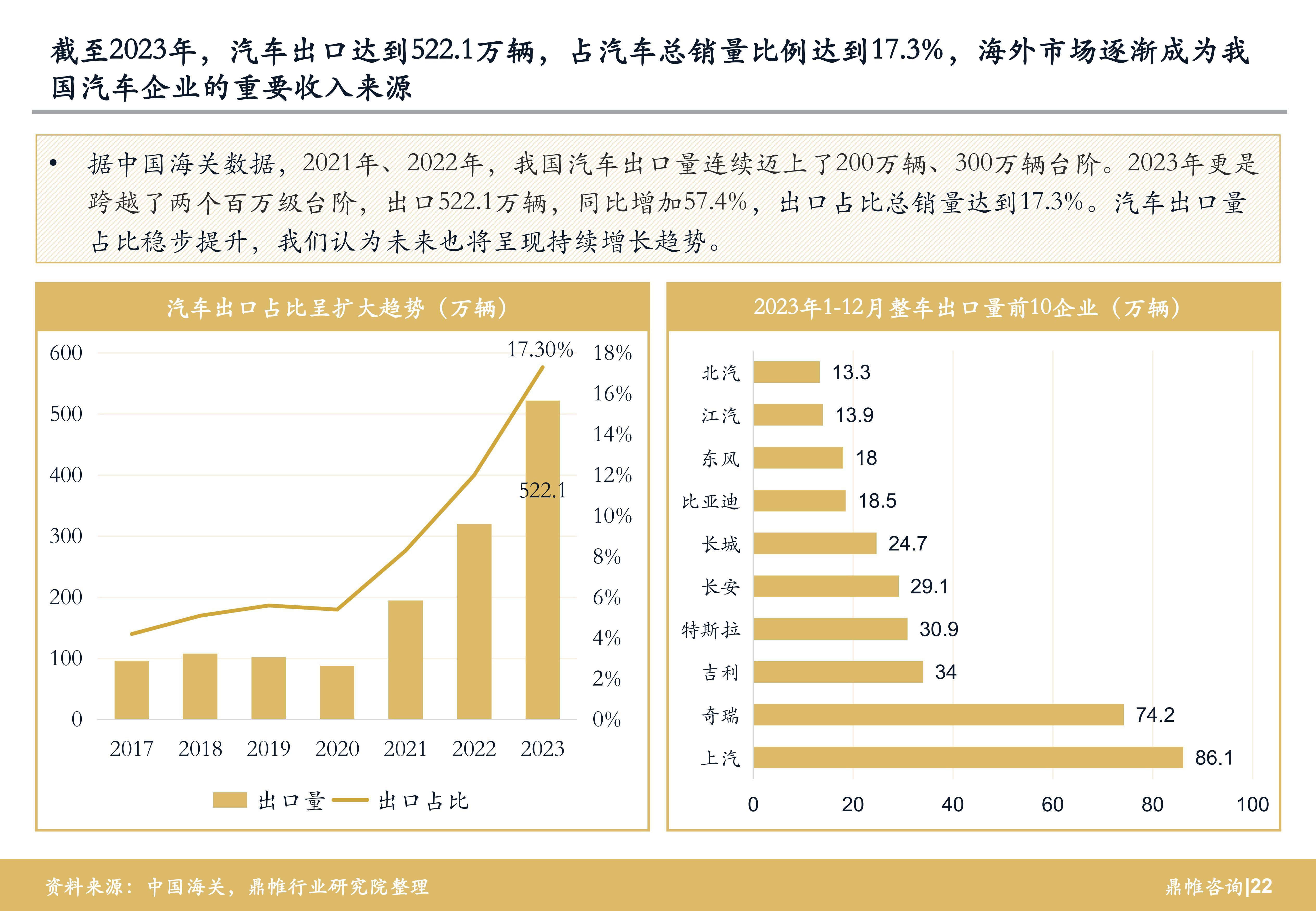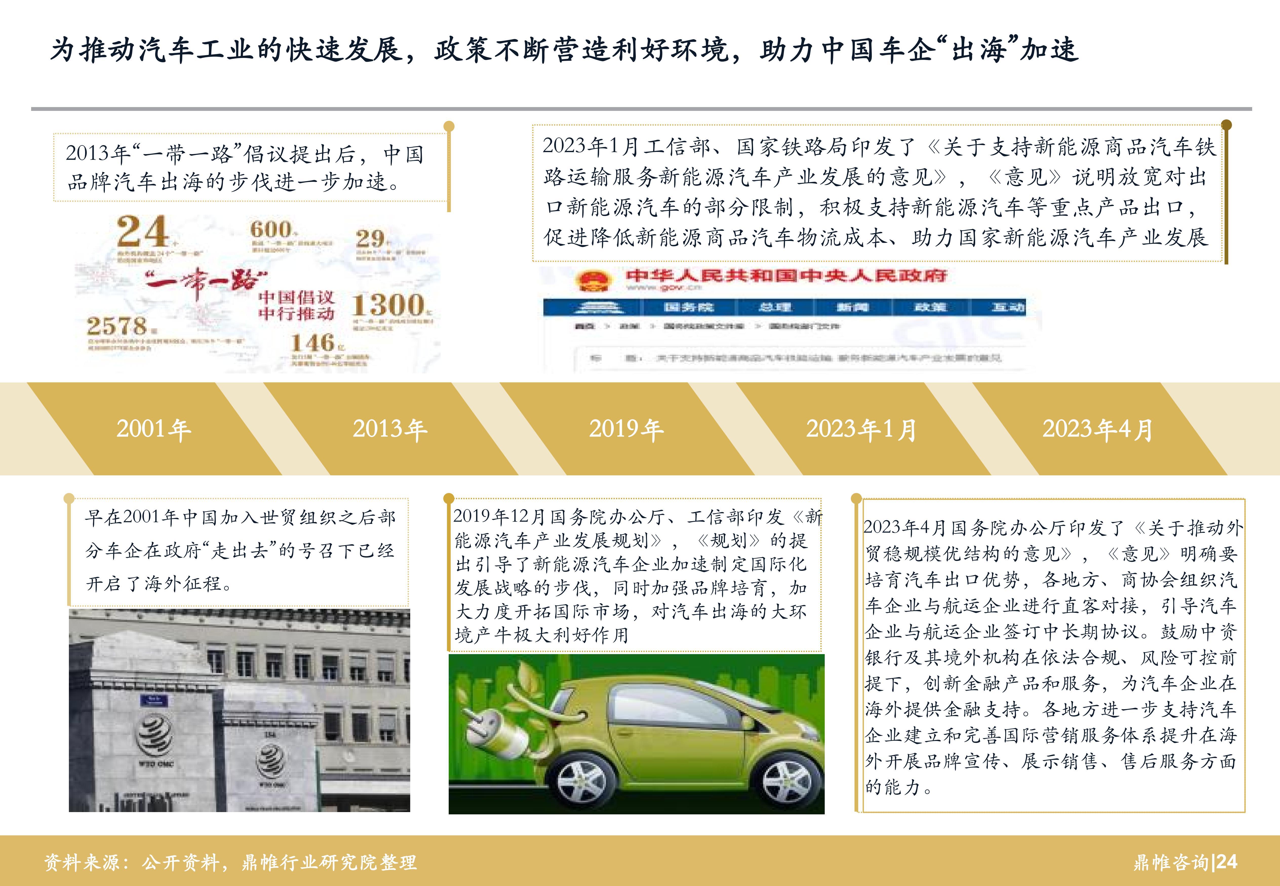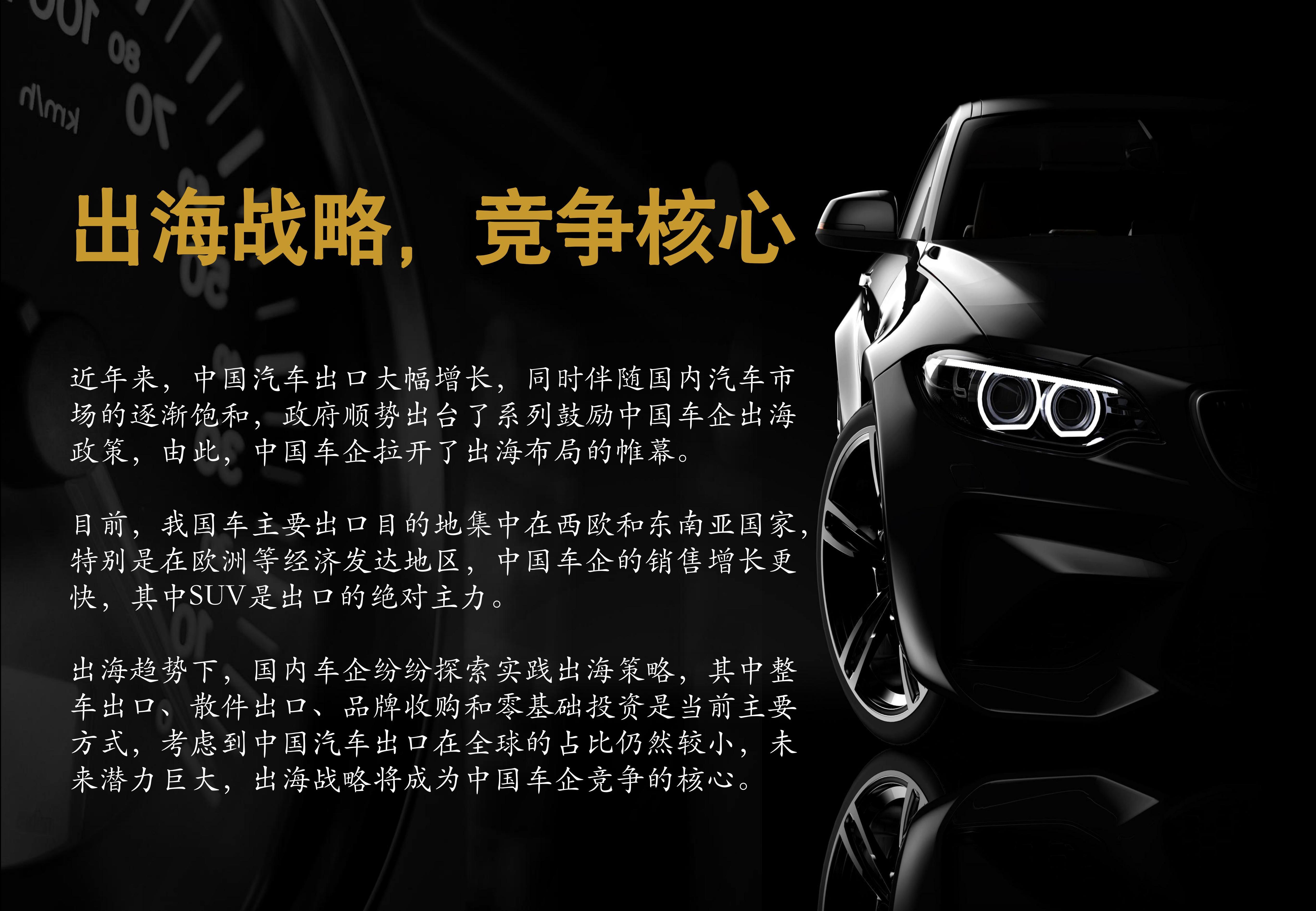 1. 近年来,中国汽车出口大幅增长,同时伴随国内汽车市场的逐渐饱和,政府顺势出台了系列鼓励中国车企出海政策,由此,中国车企拉开了出海布局的帷幕。