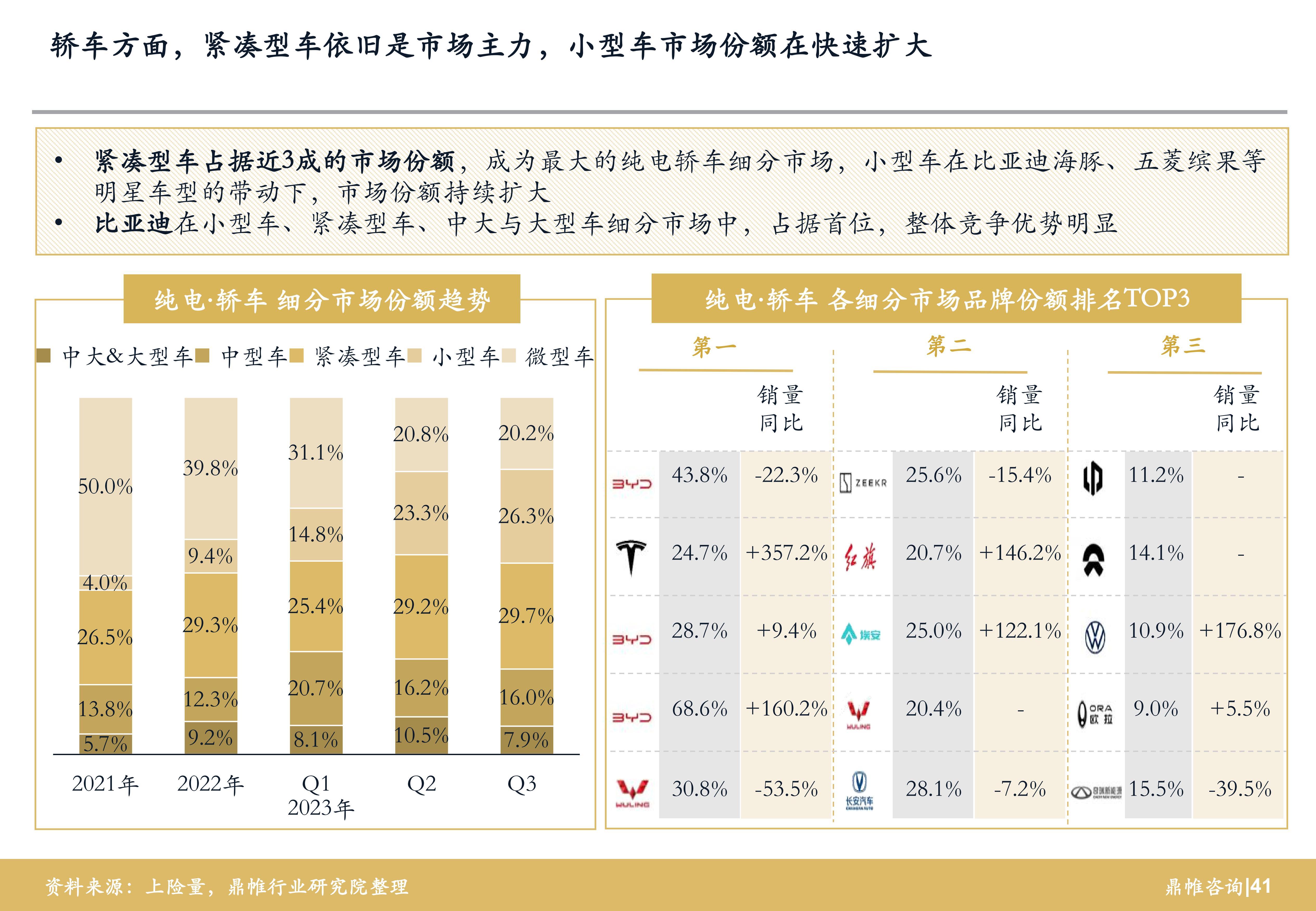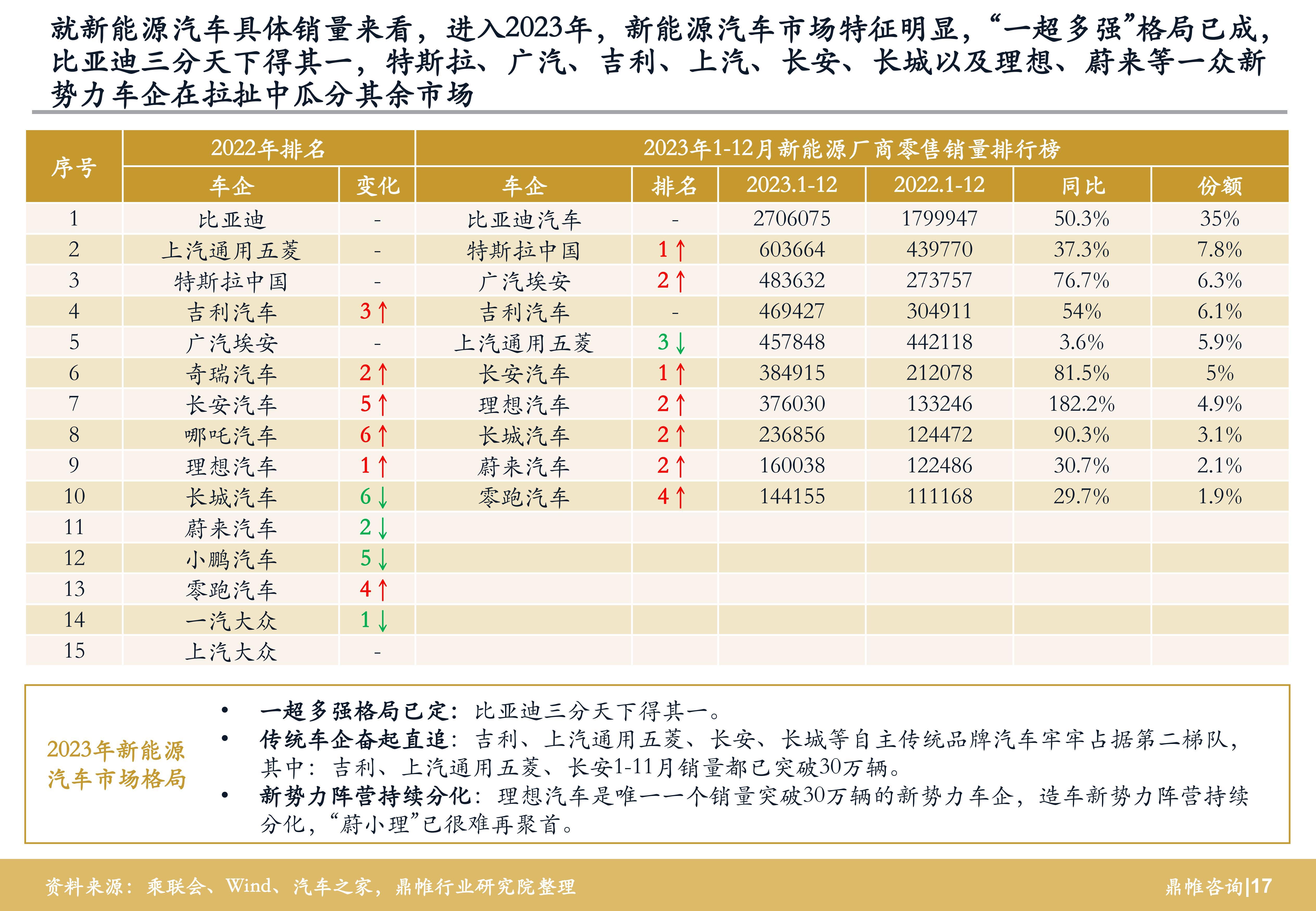 1. 汽车市场总体格局被明显重塑,比亚迪三分天下得其一特斯拉、广汽、吉利、上汽、长安、长城以及理想、蔚来等一众新势力车企在拉扯中瓜分其余市场