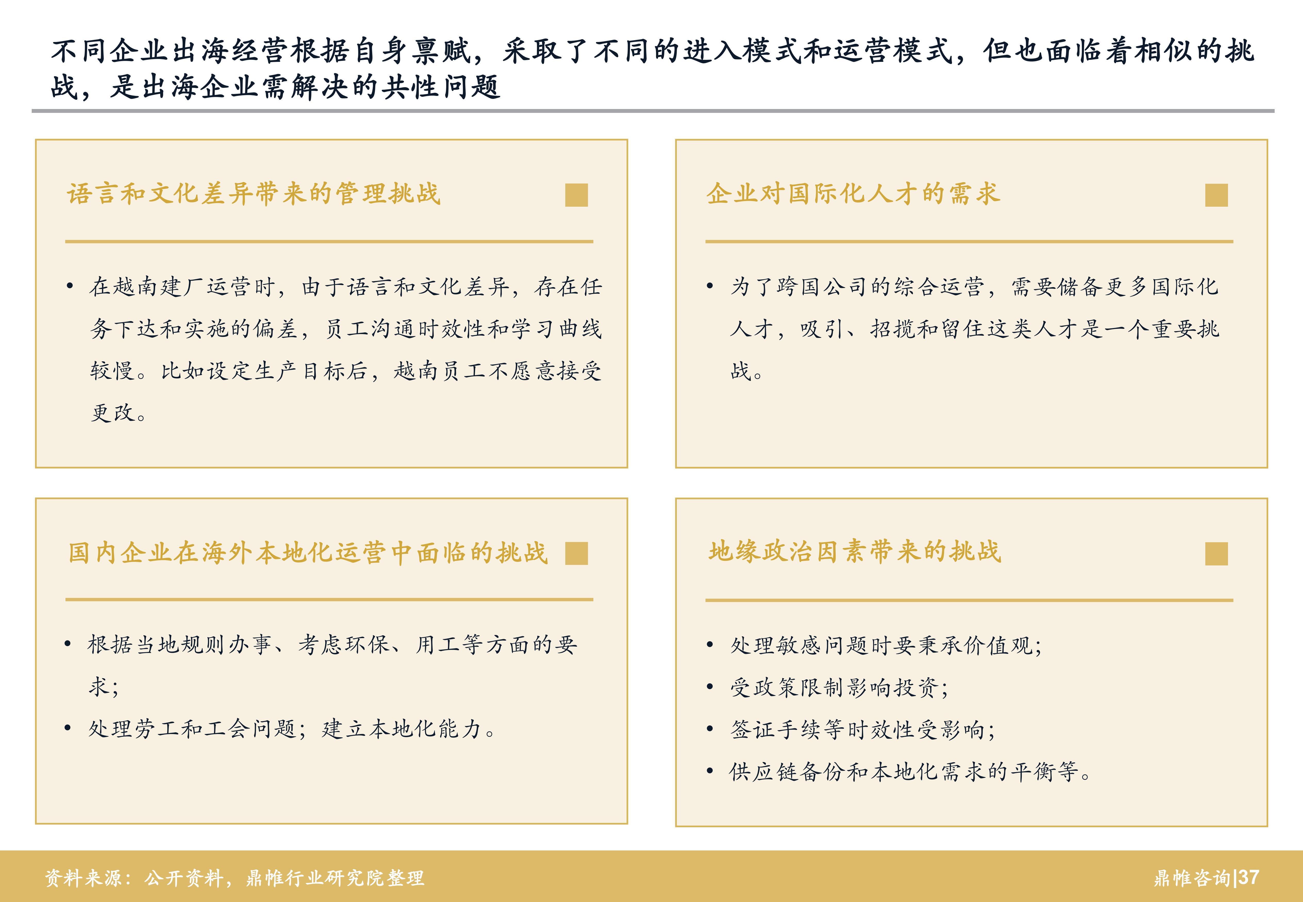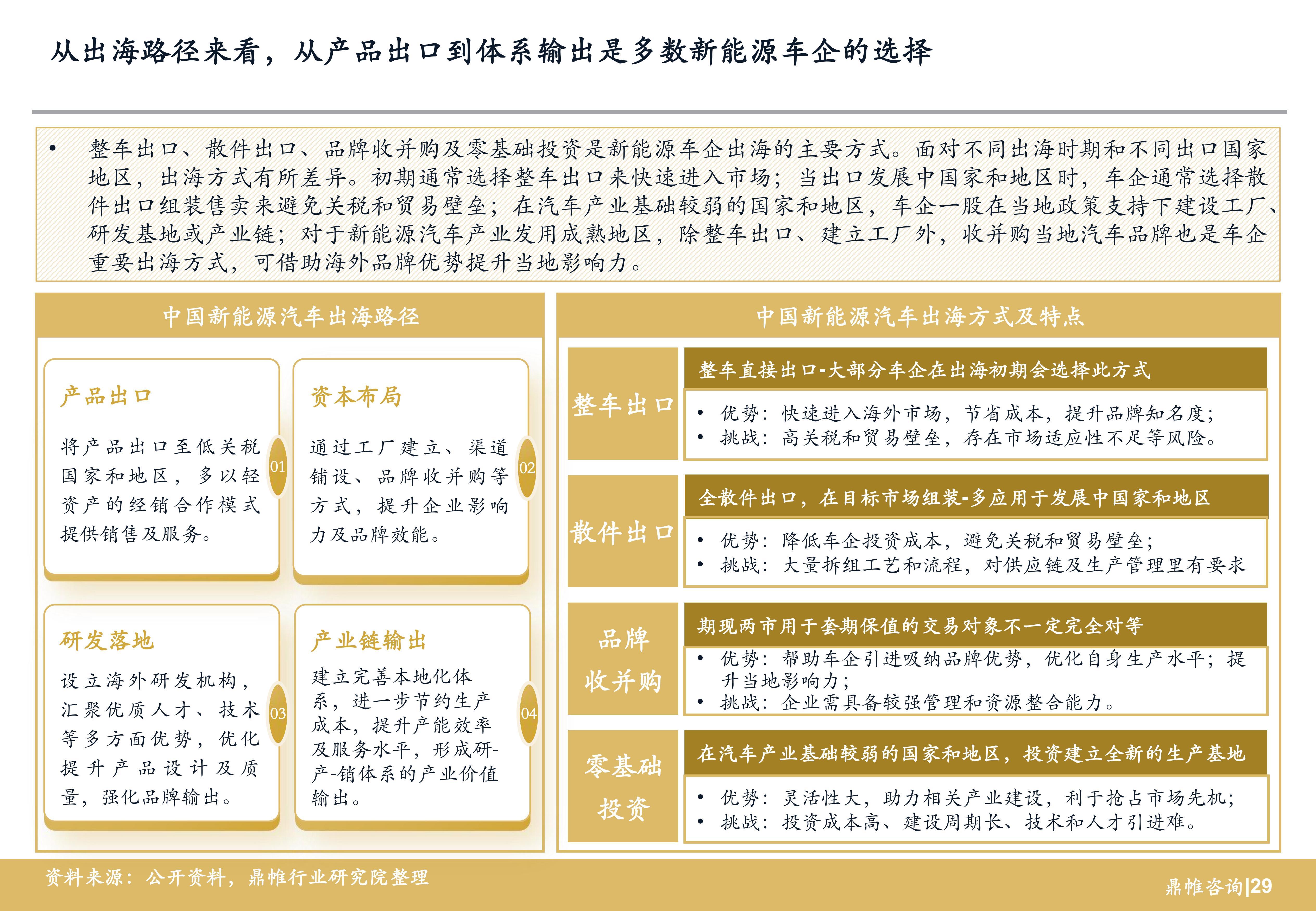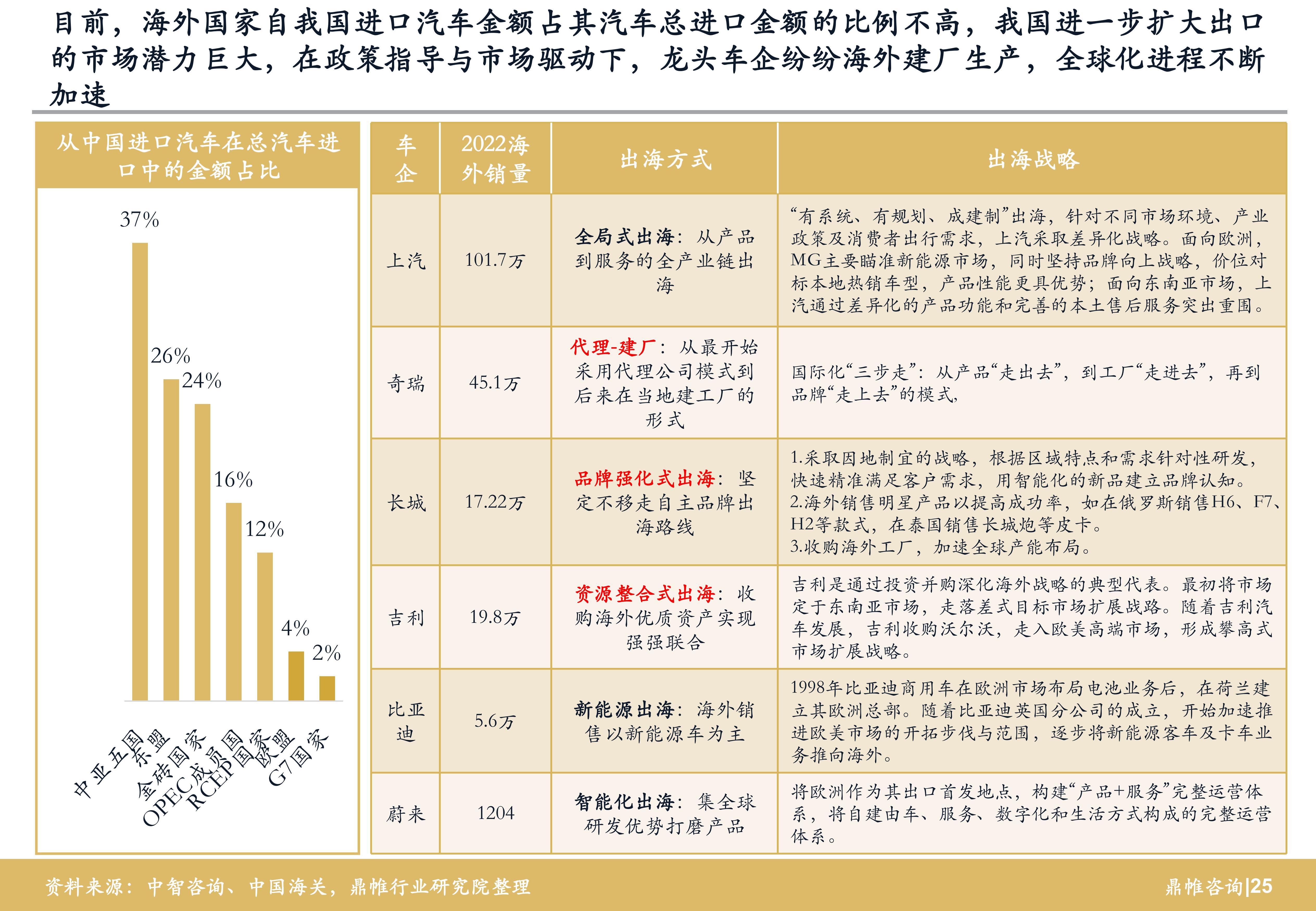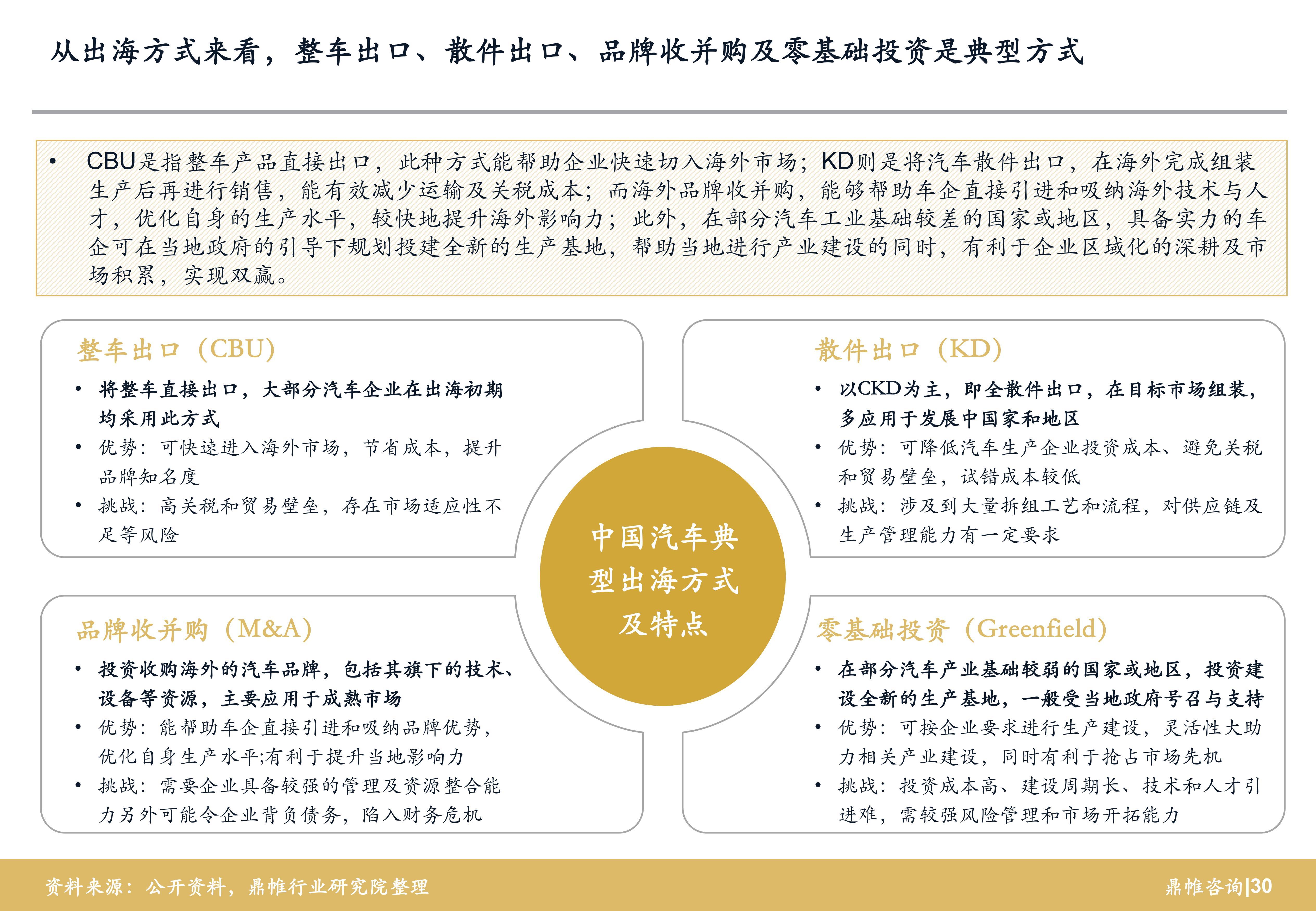 3. 出海趋势下,国内车企纷纷探索实践出海策略,其中整车出口、散件出口、品牌收购和零基础投资是当前主要方式,考虑到中国汽车出口在全球的占比仍然较小,未来潜力巨大,出海战略将成为中国车企竞争的核心。