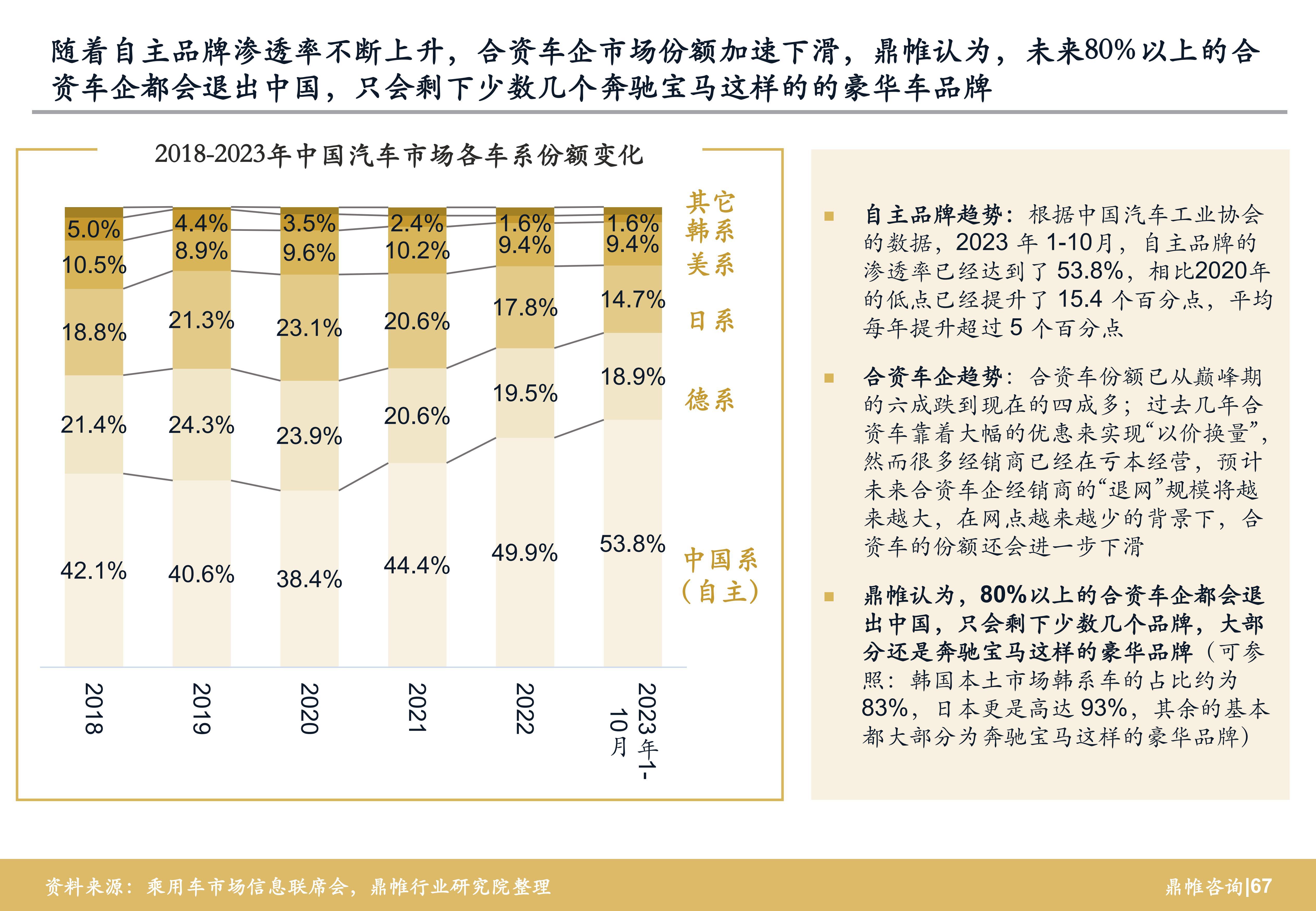 3. 随着自主品牌渗透率不断上升,合资车企市场份额加速下滑,鼎帷认为,未来80%以上的合资车企都会退出中国,只会剩下少数几个奔驰宝马这样的的豪华车品牌。