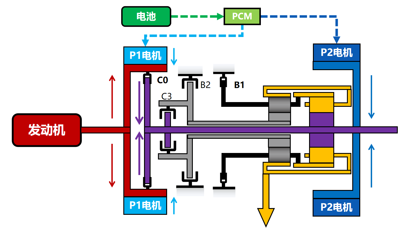 “P1电机助力驱动”指的是通过对系统功率的耦合,将原先只能用于发电/启动的P1电机增添驱动输出使命,这样新一代雷神电混就额外增加了一个能提供60kW的驱动电机。在运行层面,P1电机的功率和发动机的功率通过C0的结合一同传递至输入轴,而P2电机的功率则直接传至输入轴,最终实现P1电机、P2电机以及发动机的同轴功率输出。