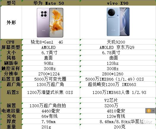 与华为mate50相比,vivox90的主要优势表现在
