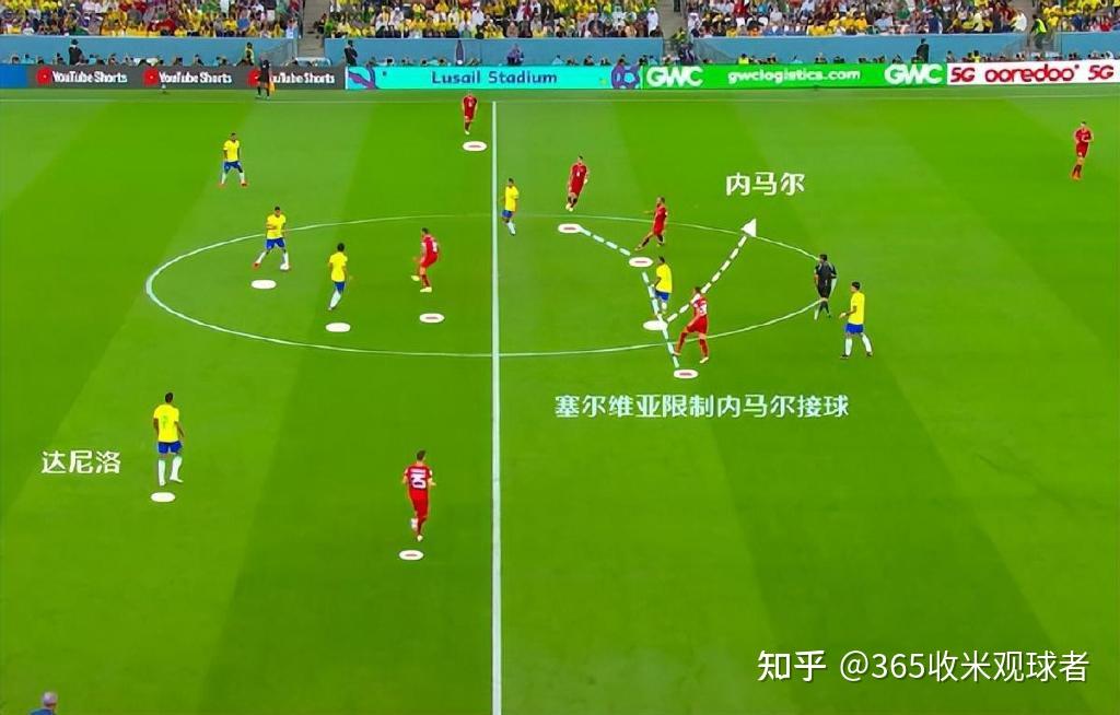 塞尔维亚球员不仅仅是边路布下重兵,他们从中圈起就会限制内马尔拿球。