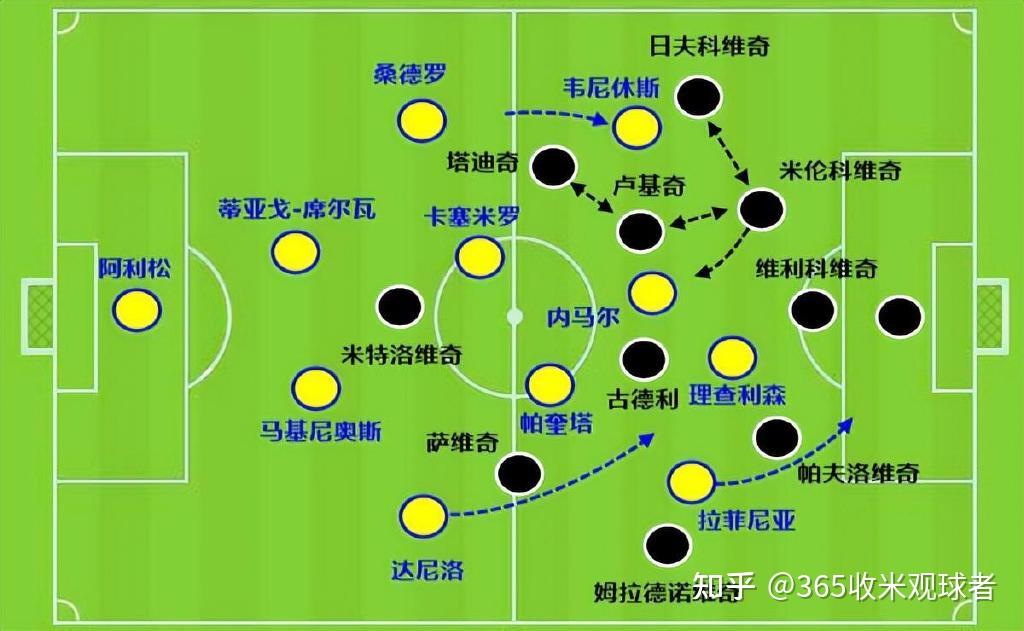 塞尔维亚这边让前腰的塔迪奇向皇马边锋靠拢,与边翼卫日夫科维奇一起形成夹击的态势。后腰卢基奇的收紧和中卫米伦科维奇的前顶,切断内马尔与左路的联系。