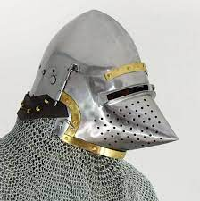 1220年-1350年间,大头盔成为西欧骑士的主要装备,不过大头盔毕竟是全罩头盔的初级版本,弱点还是很多的,比如太重,比如由于形状设计问题,天热时,人戴久了里面会很快变得酷热难耐等,所以到了14世纪,逐渐被更先进的Bascinet,又俗称蛙嘴盔取代。这个头盔的主要特点是采用钢制,改进了形状,并且有着冲锋之前可以打开面罩呼吸的设计,从而成为板甲时代的标配。文艺复兴时期又出现了更轻的Armet和Sallet(貌似前者米兰式,后者哥特式)。