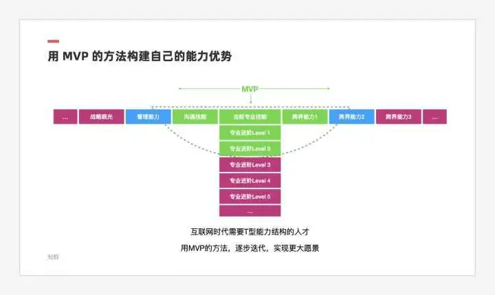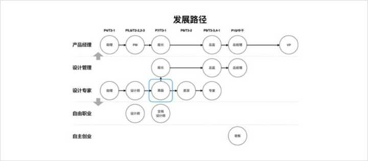 下面这是我们的一位朋友,大众点评的 UED 总监的一个 PPT 里的一张图,讲到了设计师的成长路径: