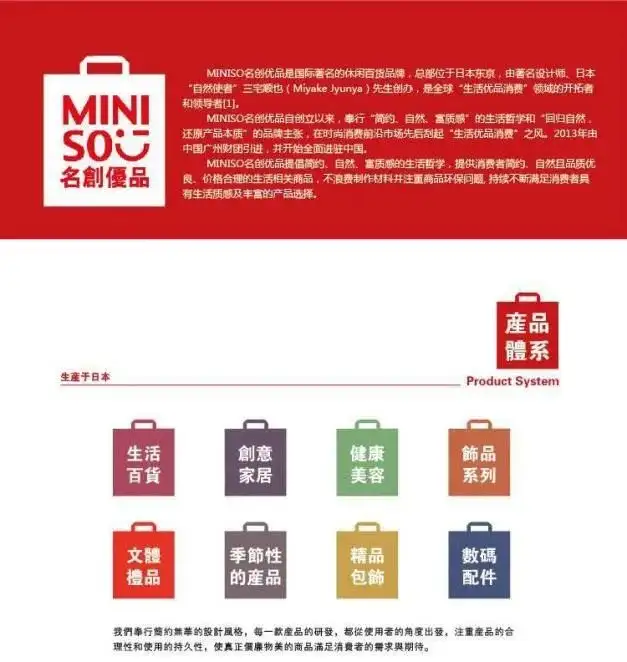 “MINISO名创优品是国际著名休闲百货品牌,总部位于日本东京,由著名设计师、日本‘自然使者’三宅顺也先生创办……2013年由中国广州财团引进,并开始全面进驻中国。”