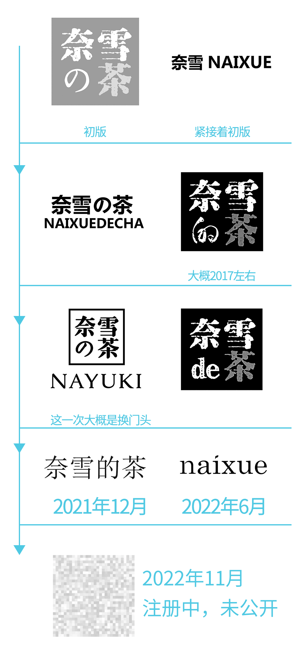 其实早期就备着“NAIXUE”、“奈雪的茶”和“奈雪de茶”。然后很长时间内都是在注册“奈雪”、“奈雪の茶”、“NAYUKI”以及那些霸气XX的品名。