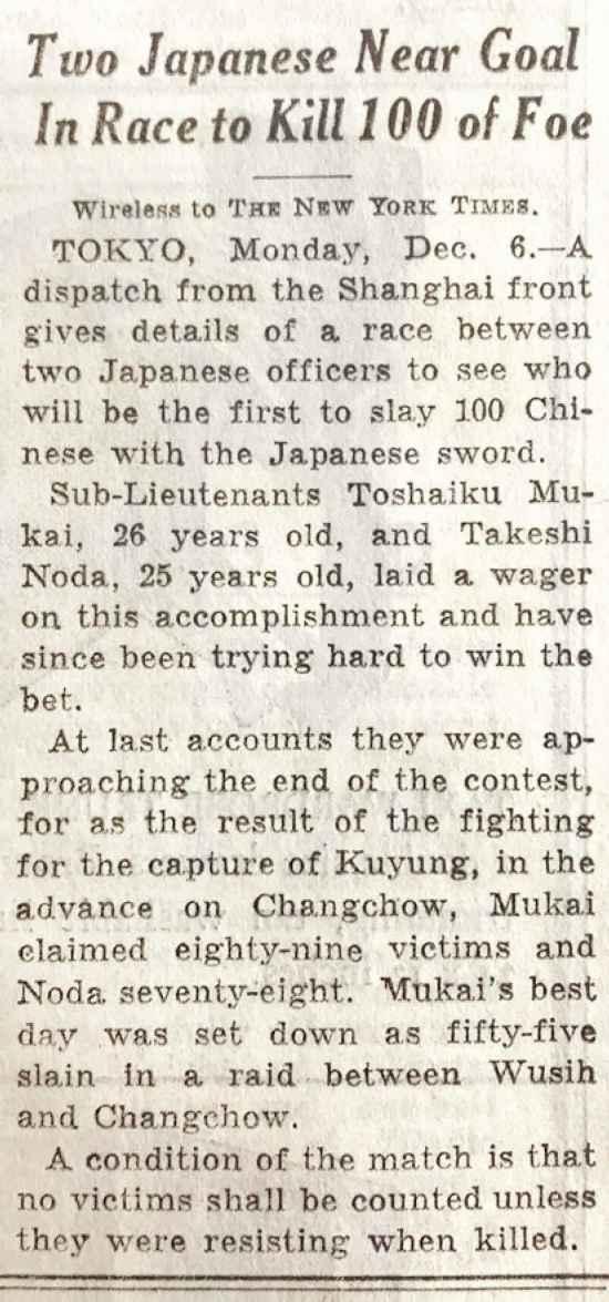 1937年12月6日的《纽约时报》记录了日军的“百人斩”暴行。