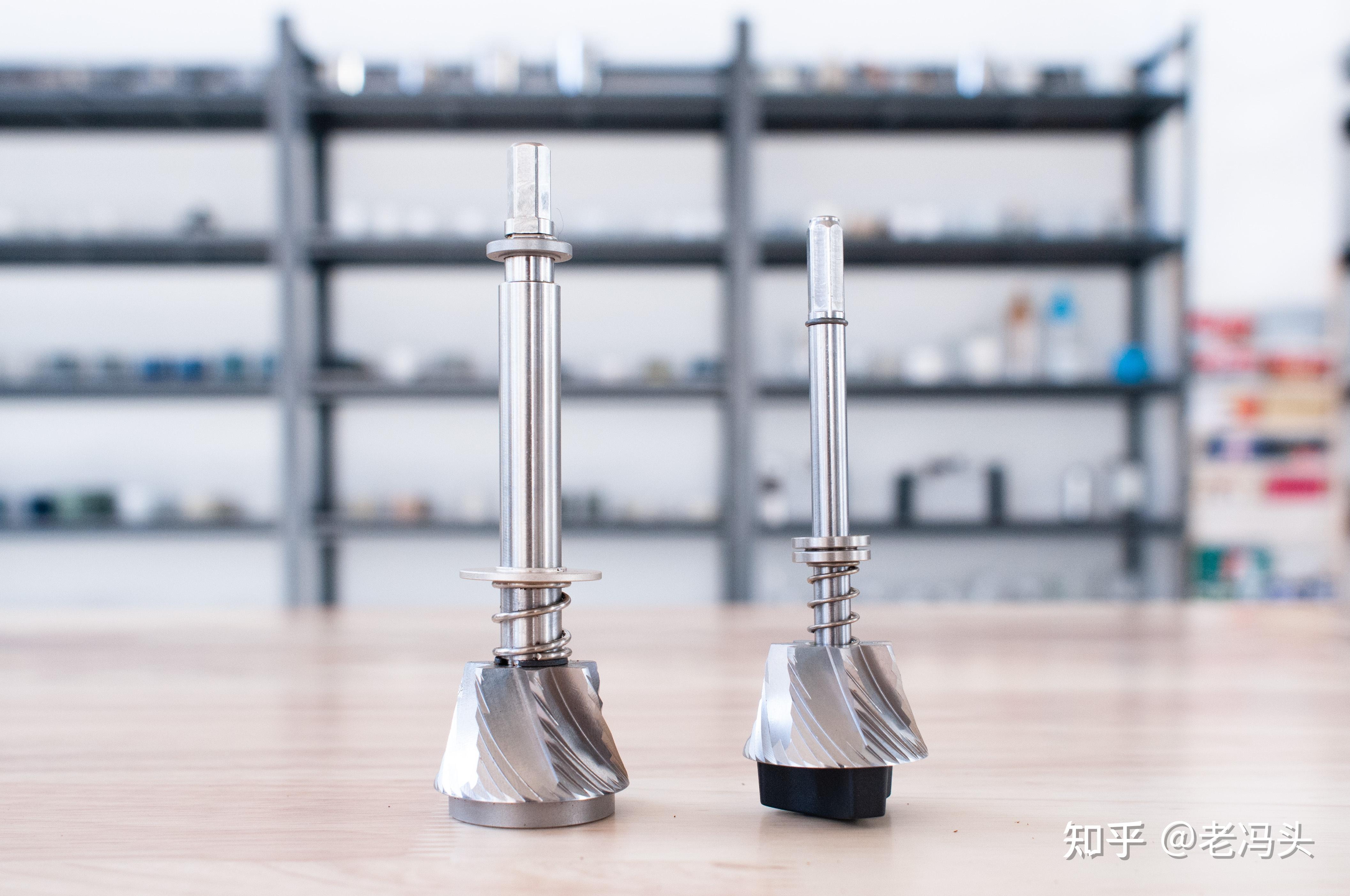 左:汉匠 K6,右:司令官 C40 C40的弹簧更长,弹力非线形回馈力度更强,这一点更有利于处理进豆时的扭力问题。如果扭力过大,磨芯会有一定的旷量,可进行垂直移动,有效的保护了刀盘。