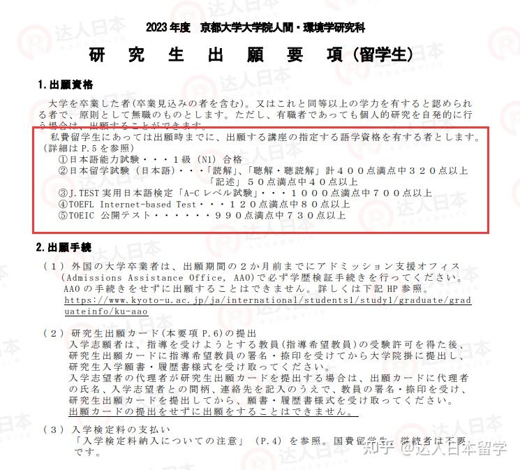 申请研究生的话,校方着重的是你提供相应的日语能力证明,是不是会必须要求N1证书,是存在变数的。以京都大学人间环境学部为例,见下图