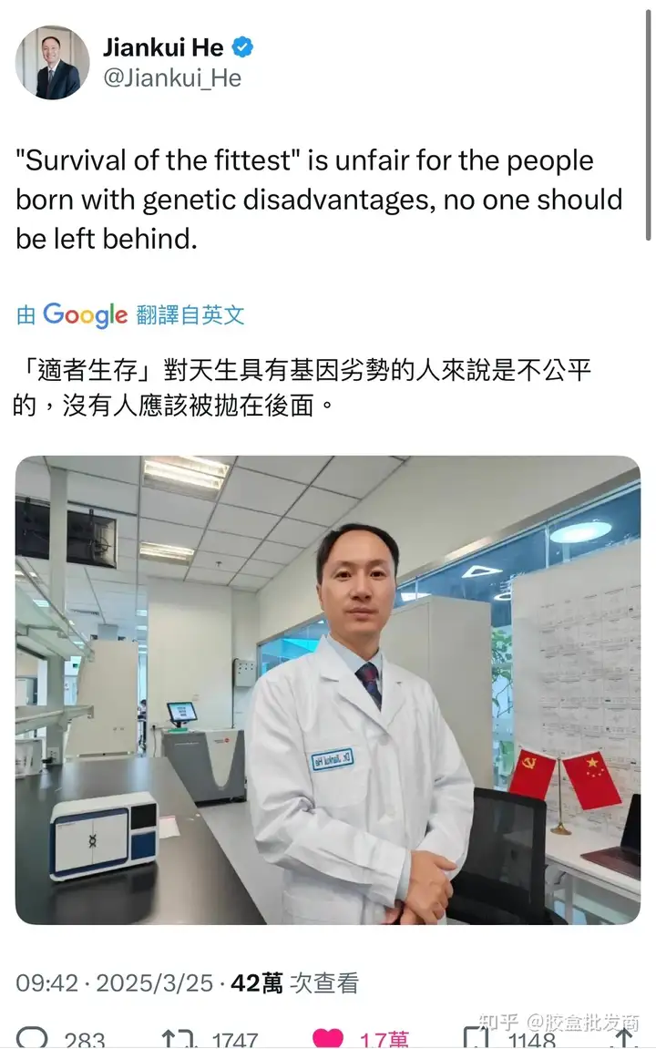 这种毫无科学伦理道德和敬畏心的人居然还能再开基因实验室,或许不是资本支持这么简单了。一个石井四郎式的人物,居然还能被允许重建实验室,可能相关审批的行政机关也没什么伦理道德观吧。